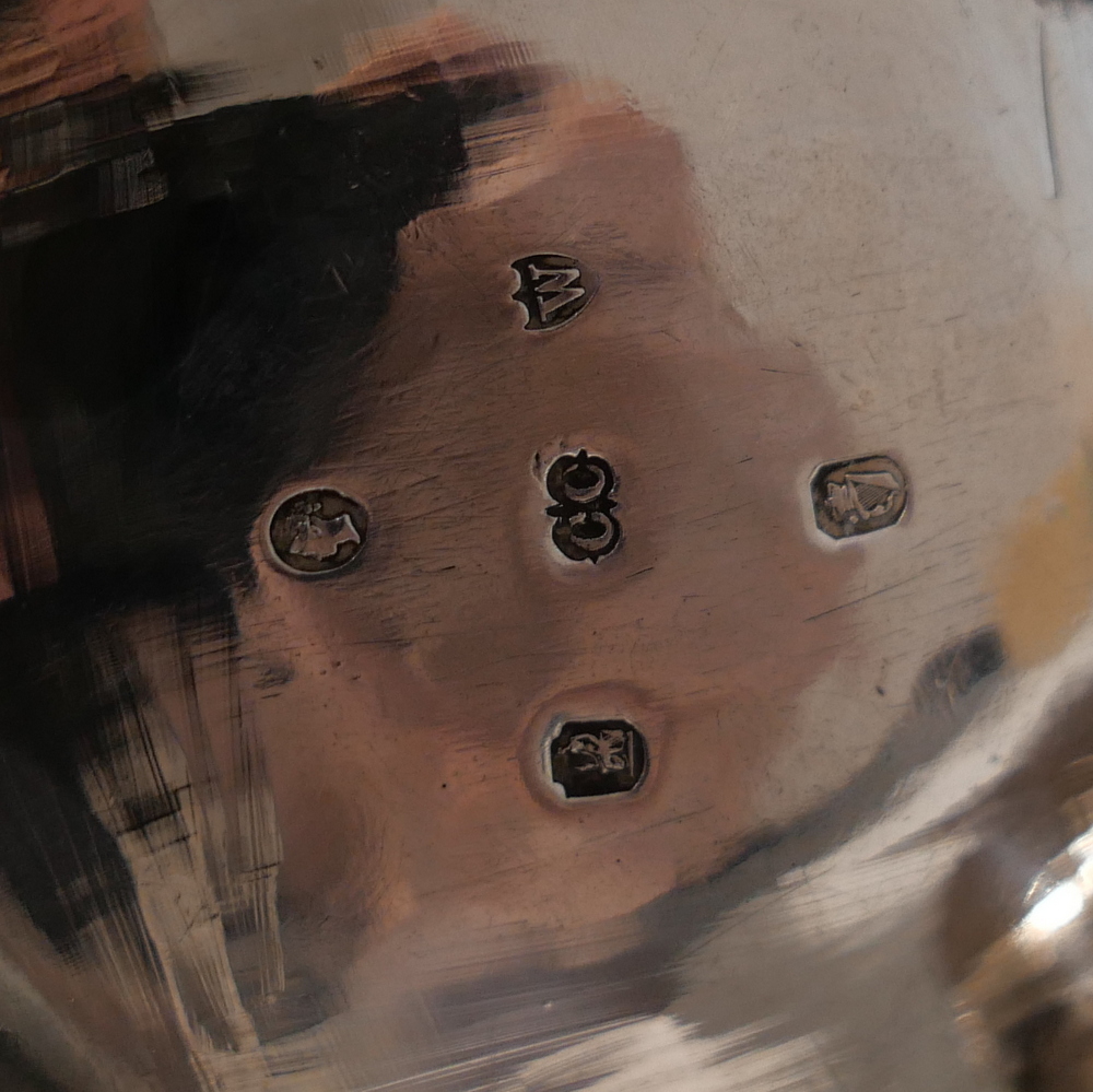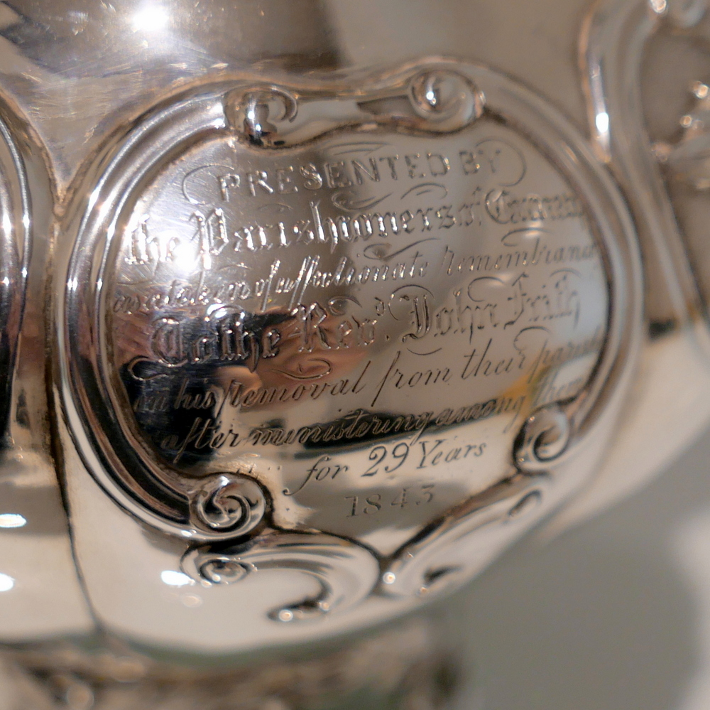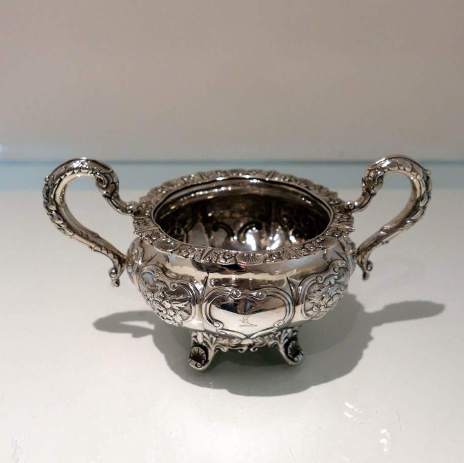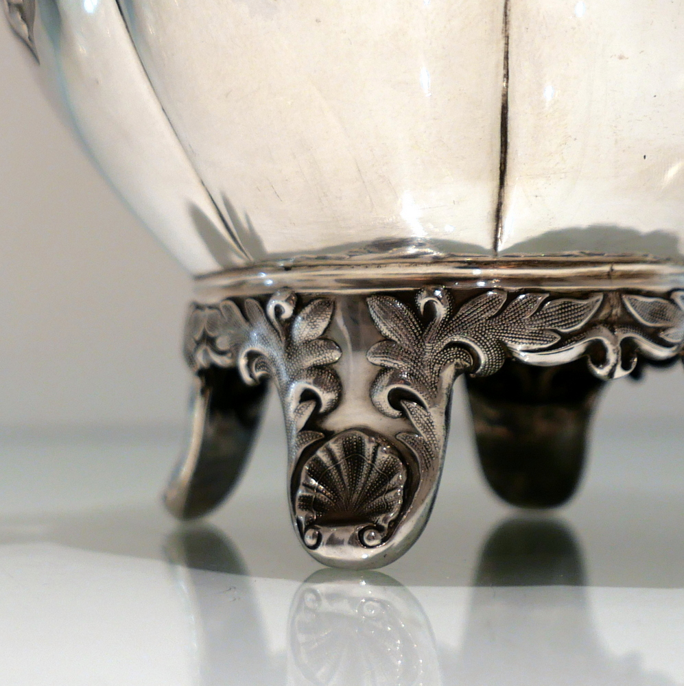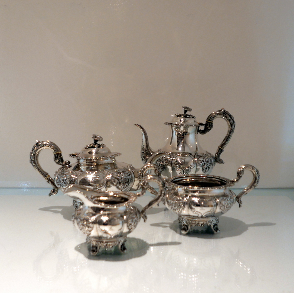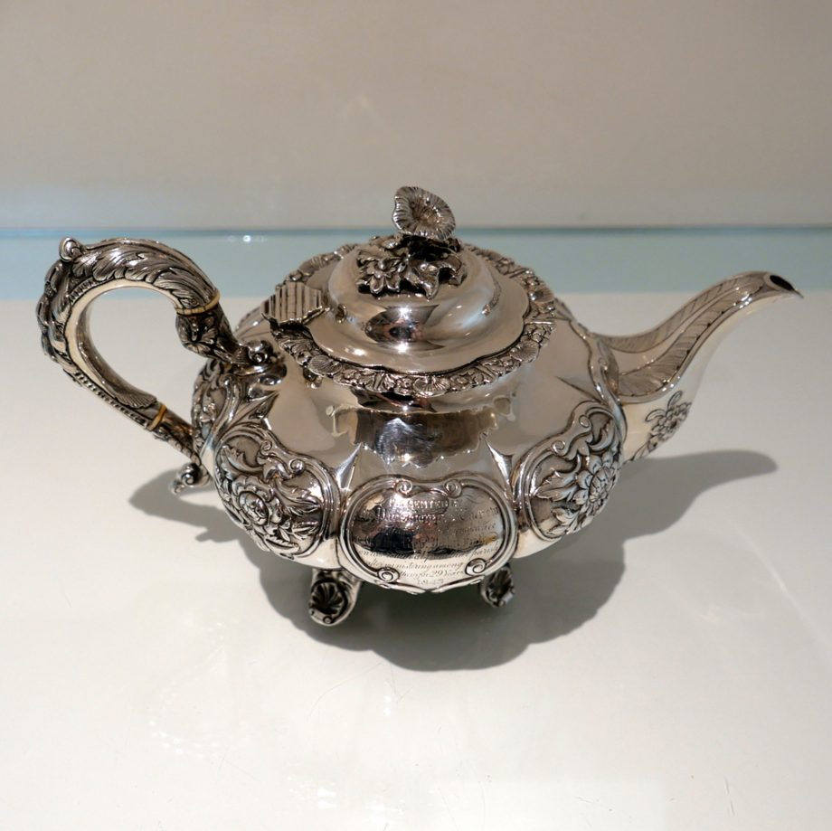 A beautiful “melon” shaped early Victorian Dublin made four piece tea and coffee set decorated with elegant framed floral cartouches. Â The handle and spout have additional elegant floral decoration and stylish contemporary inscriptions and crests for importance.