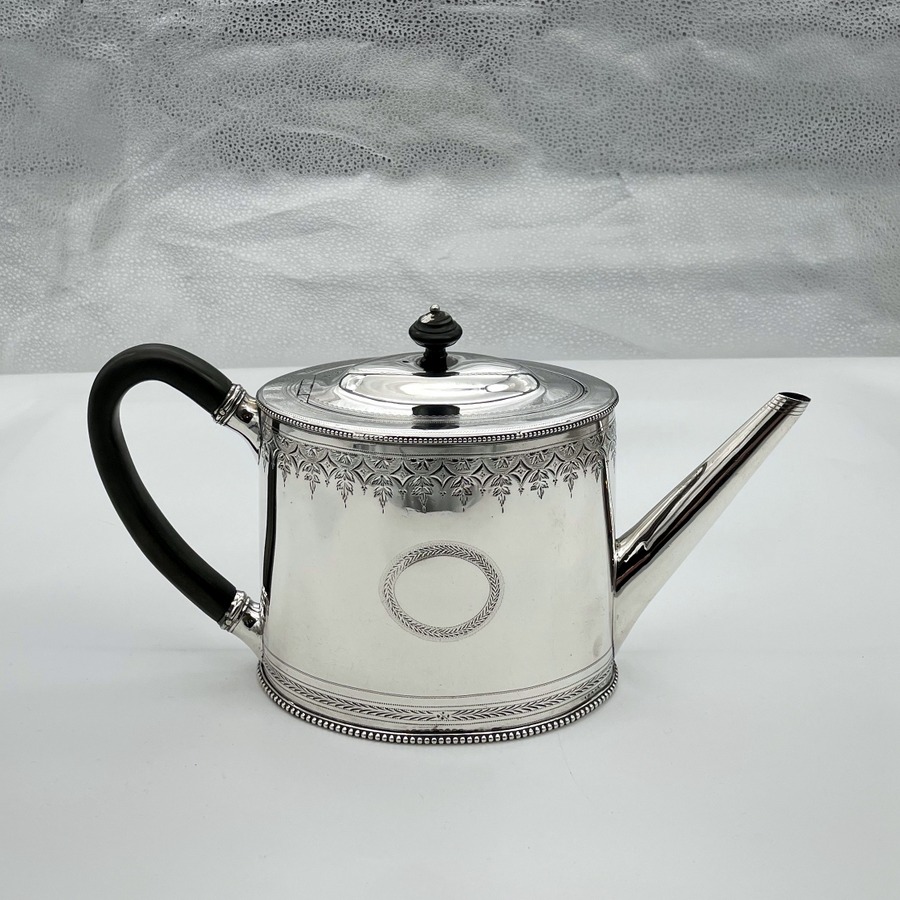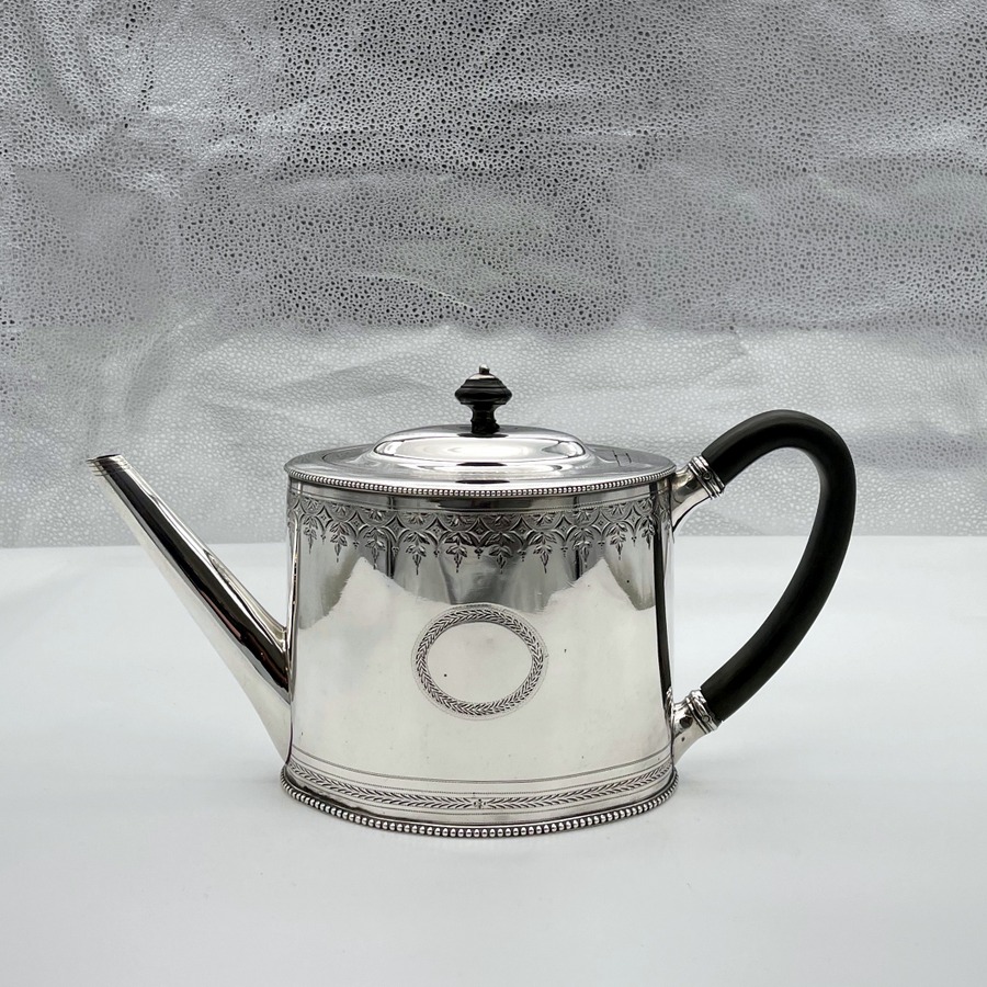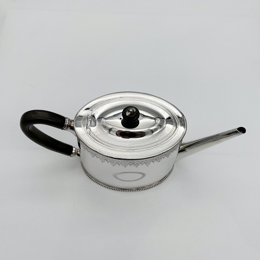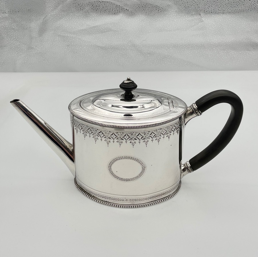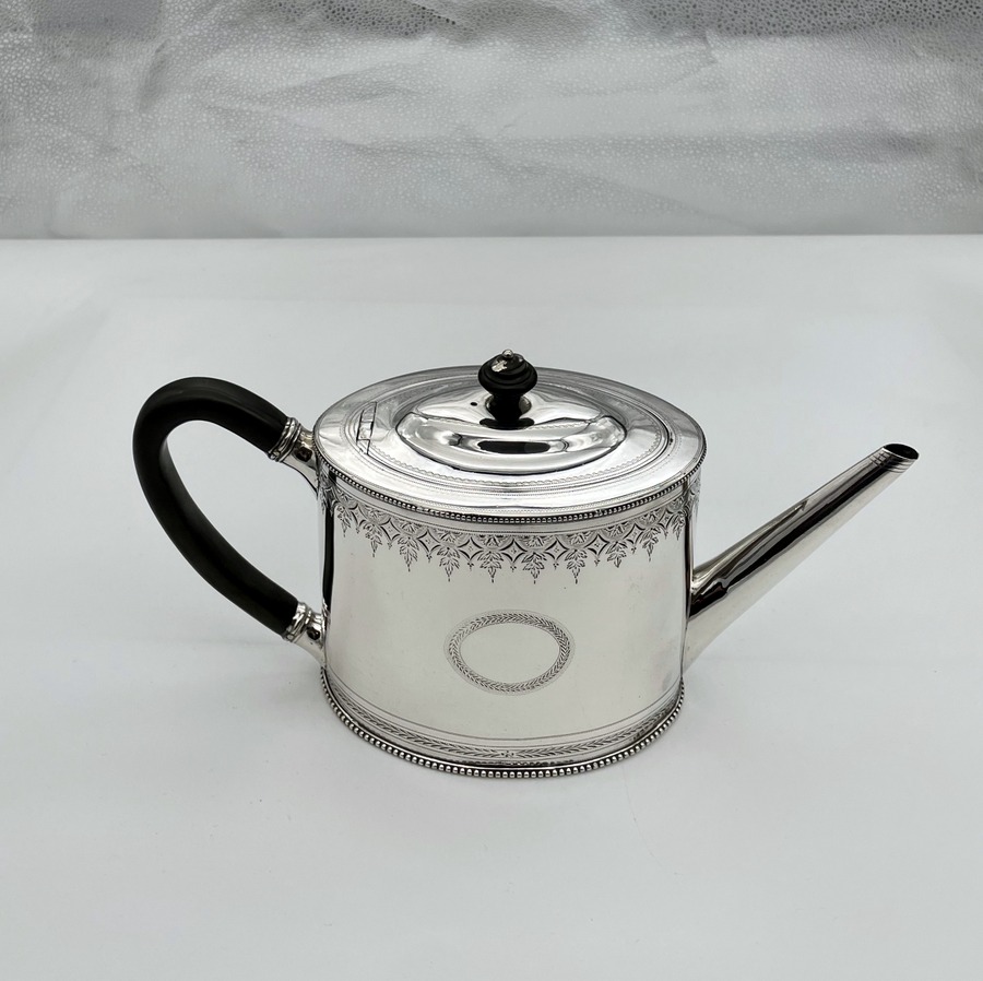 A large pristine looking Georgian silver flush hinged oval shaped teapot decorated with upper and lower bead borders as well gallery bands of intricate bright cut engraving. Â The teapot has stylish cartouches and a fruitwood scroll handle.