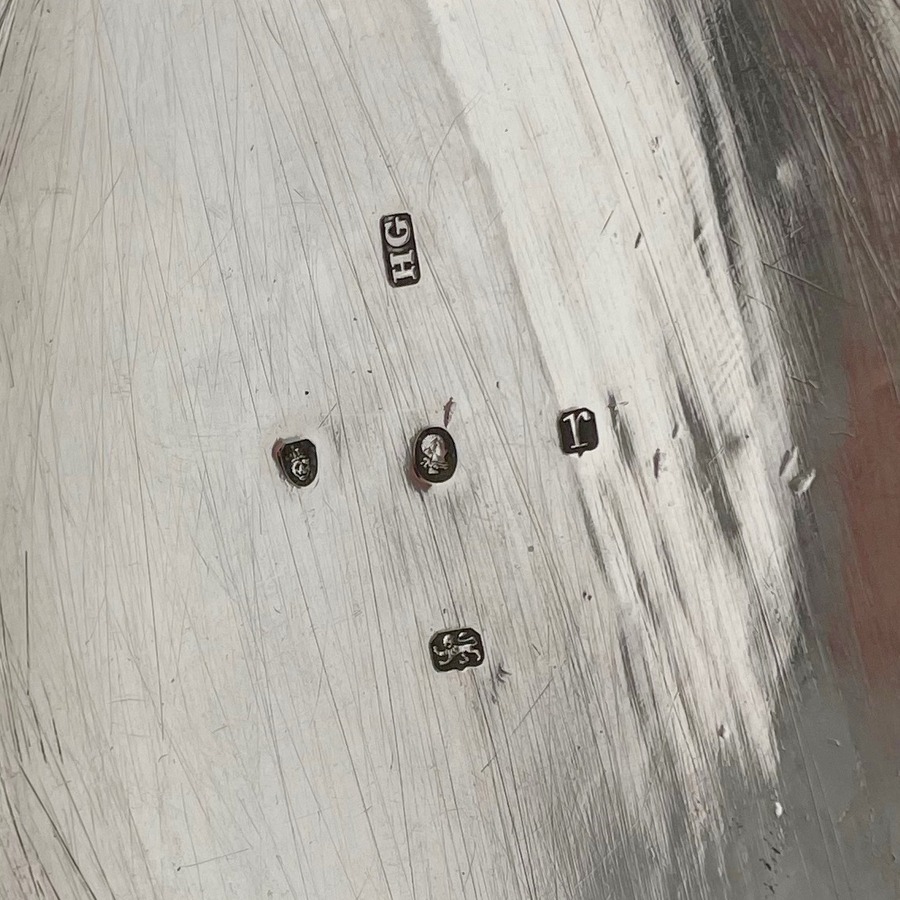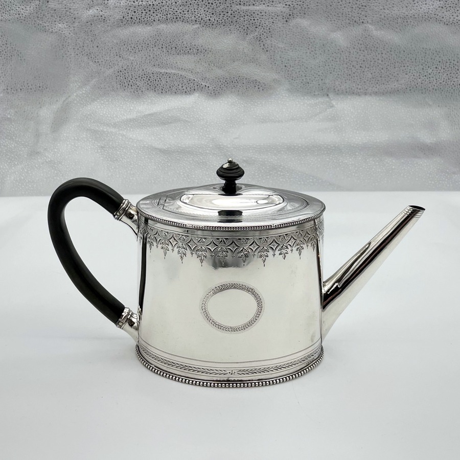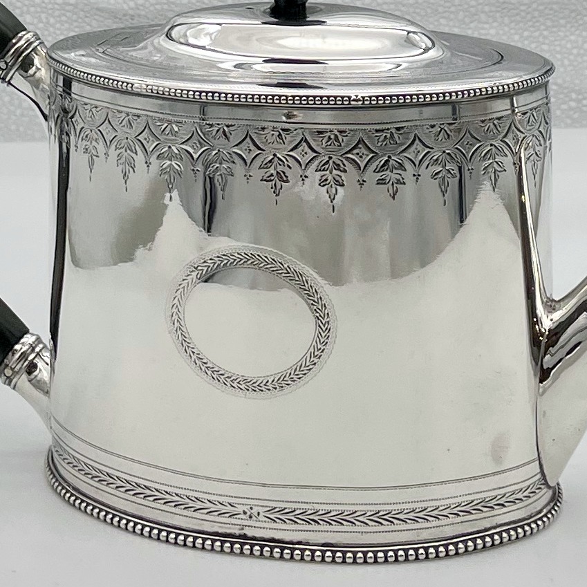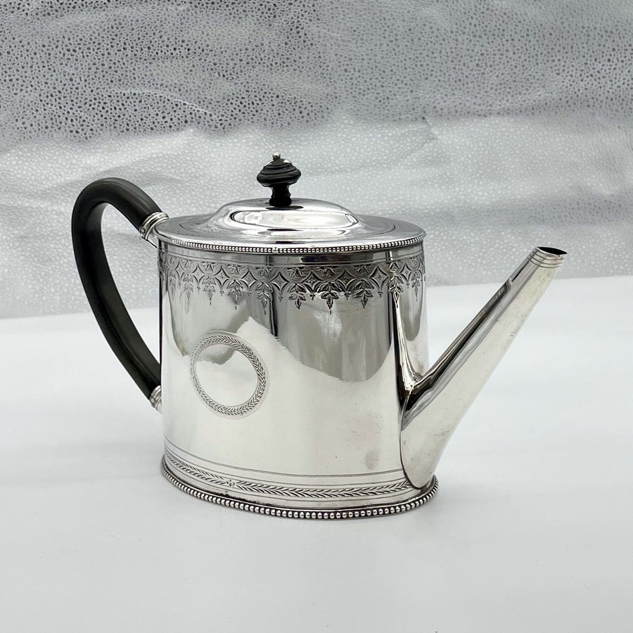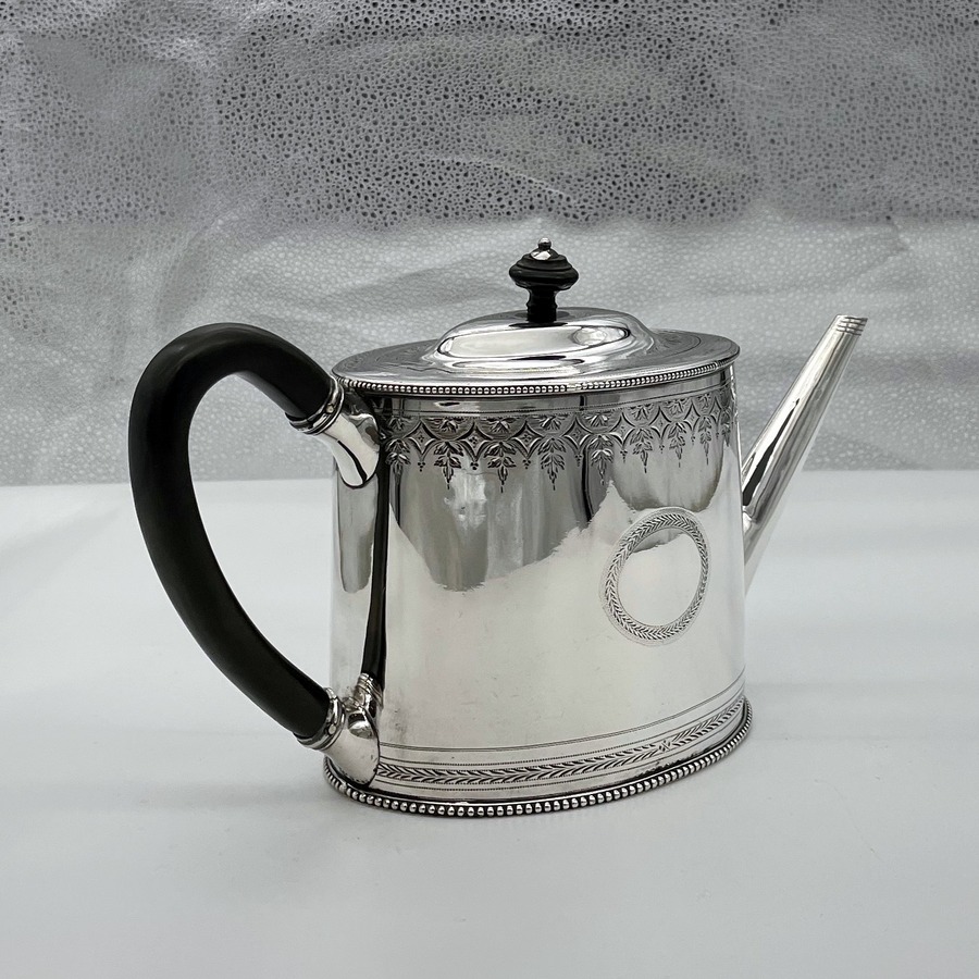 A large pristine looking Georgian silver flush hinged oval shaped teapot decorated with upper and lower bead borders as well gallery bands of intricate bright cut engraving. Â The teapot has stylish cartouches and a fruitwood scroll handle.