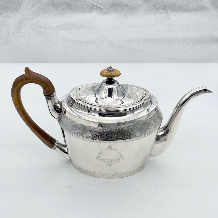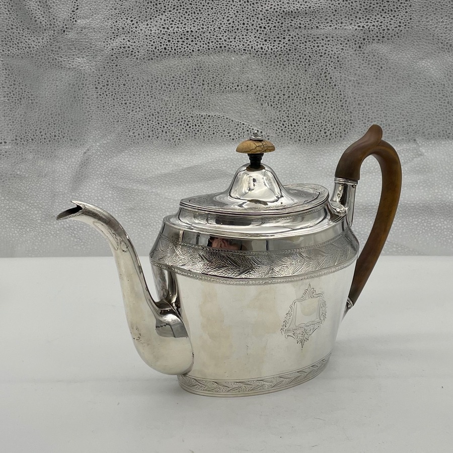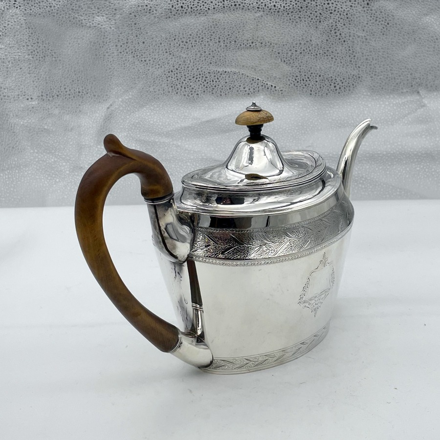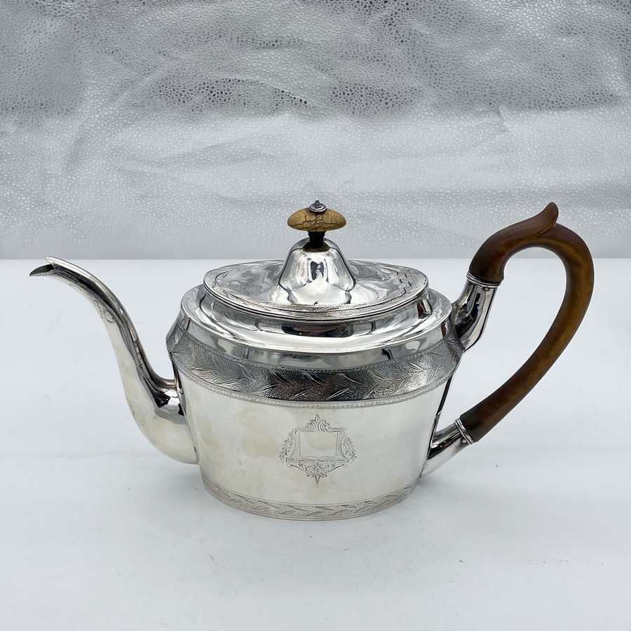 A delightful Georgian silver oval shaped teapot decorated with intricate bands of floral bright cutting and a wonderful central plain formed gallery which has beautiful hand engraved cartouches.