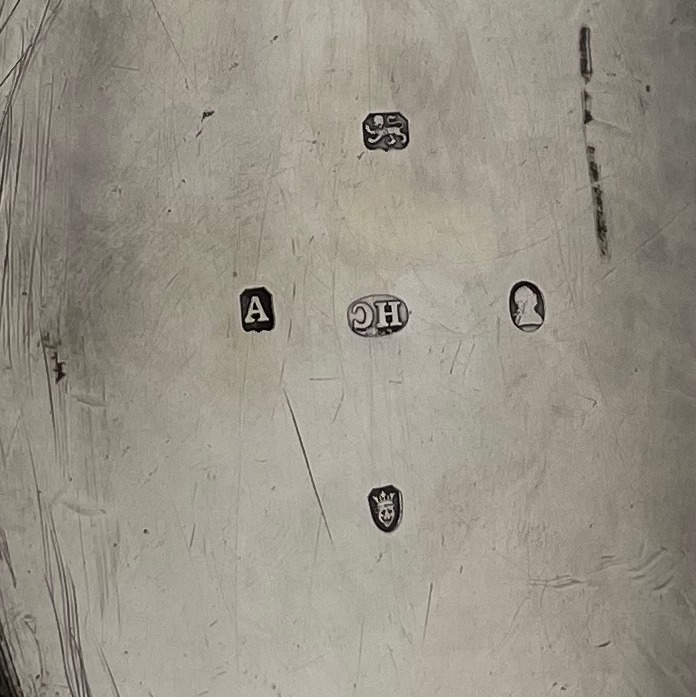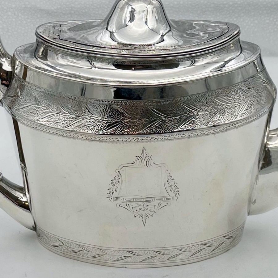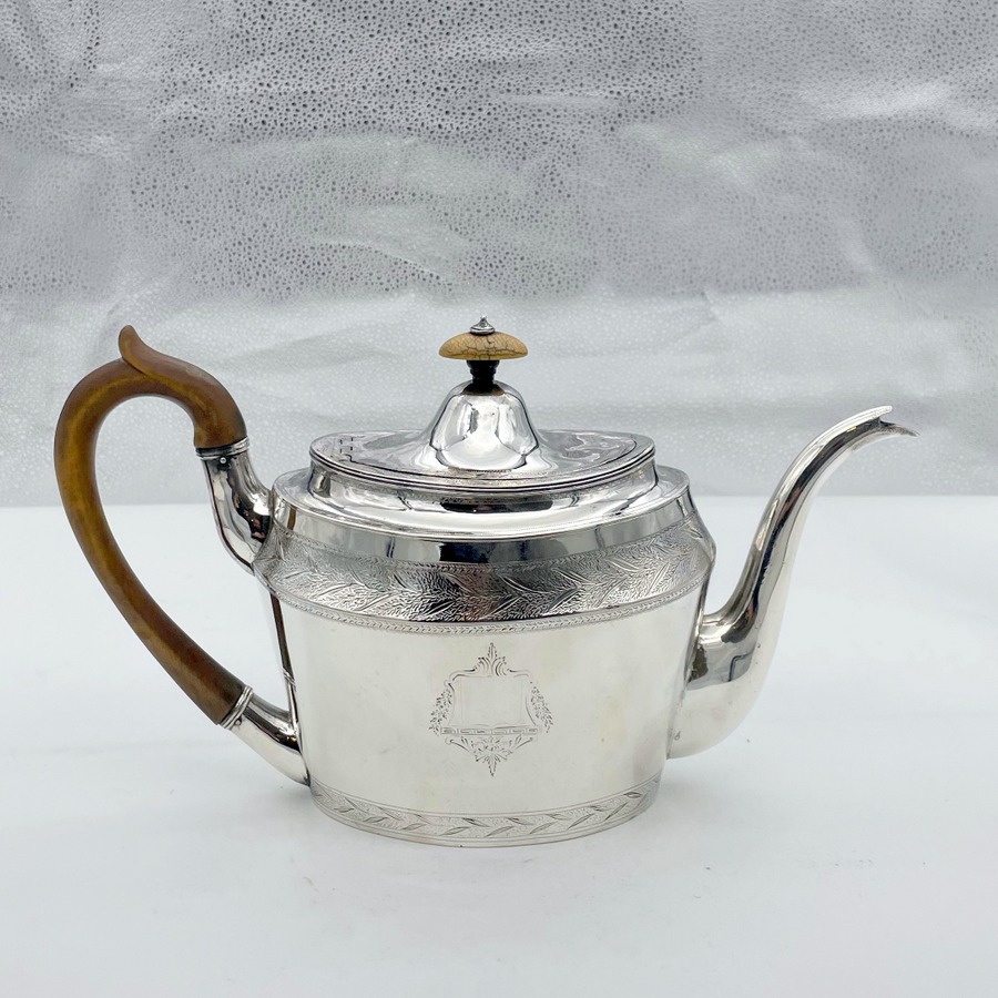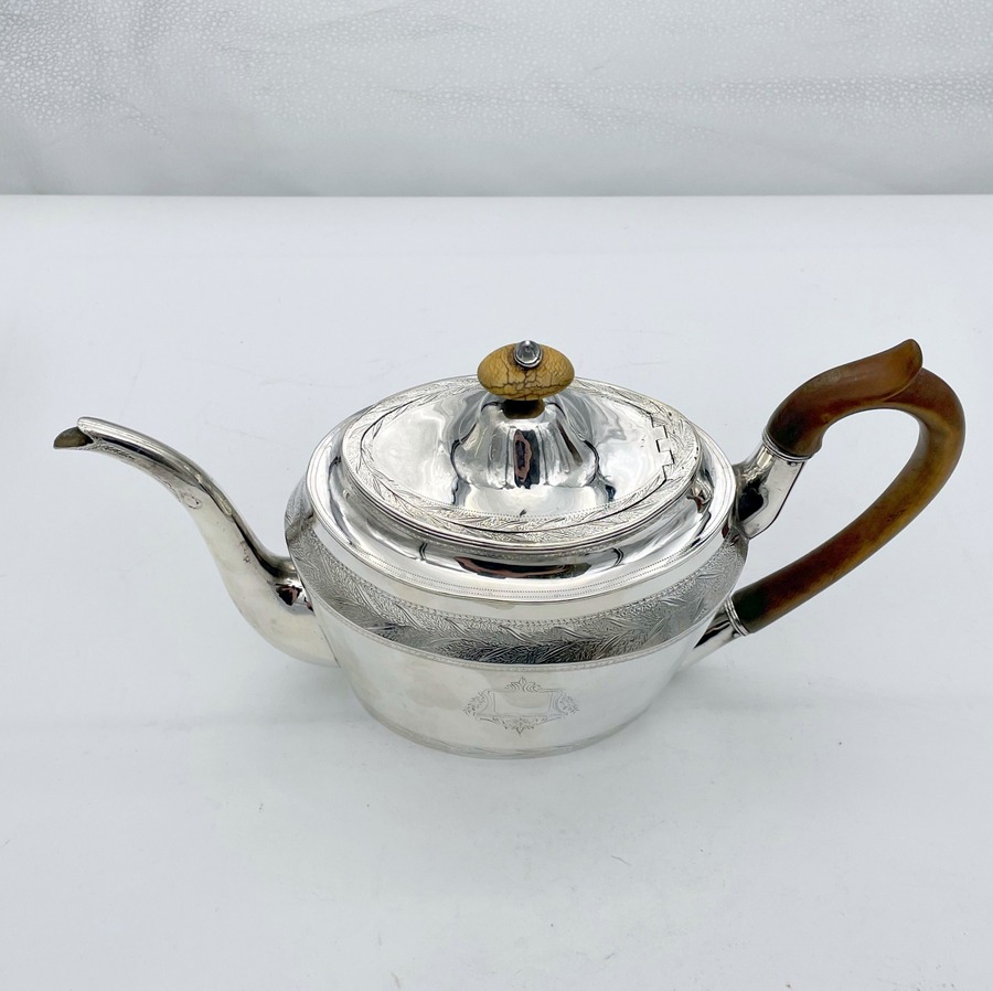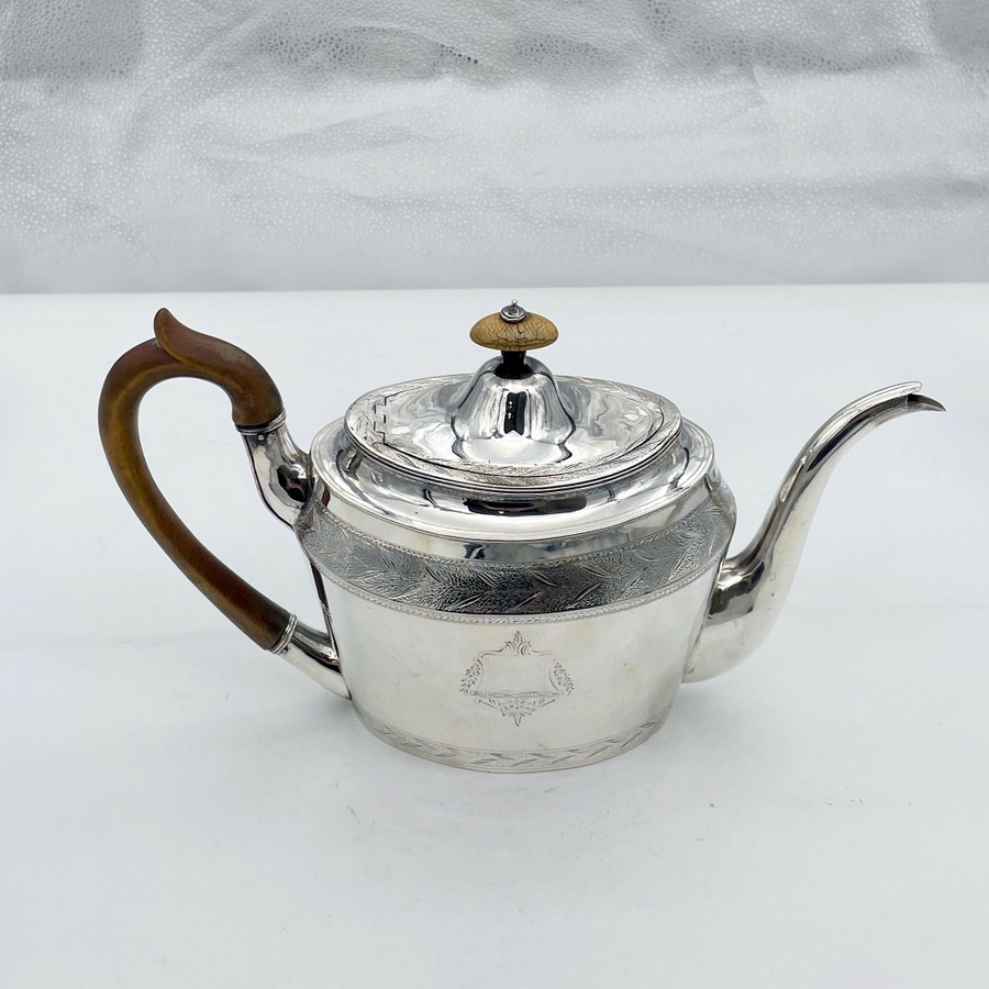 A delightful Georgian silver oval shaped teapot decorated with intricate bands of floral bright cutting and a wonderful central plain formed gallery which has beautiful hand engraved cartouches.