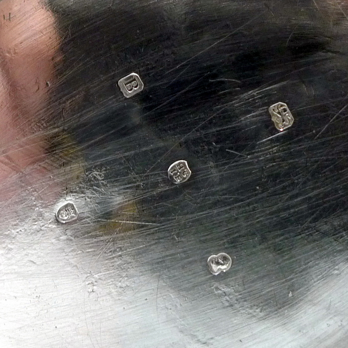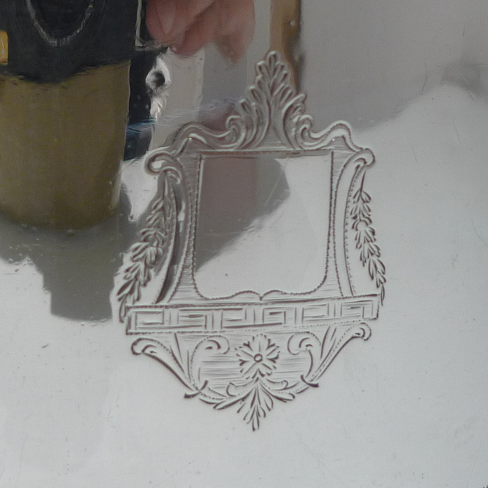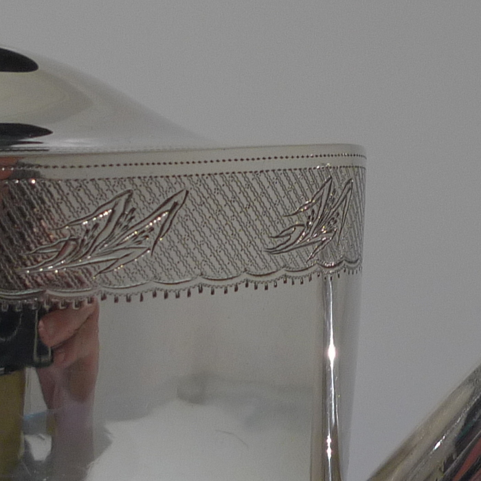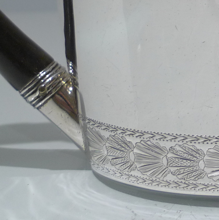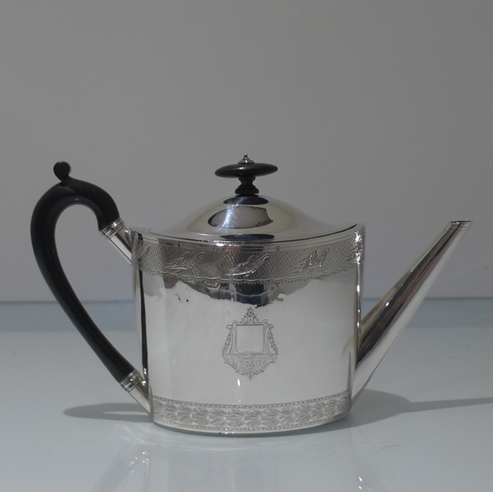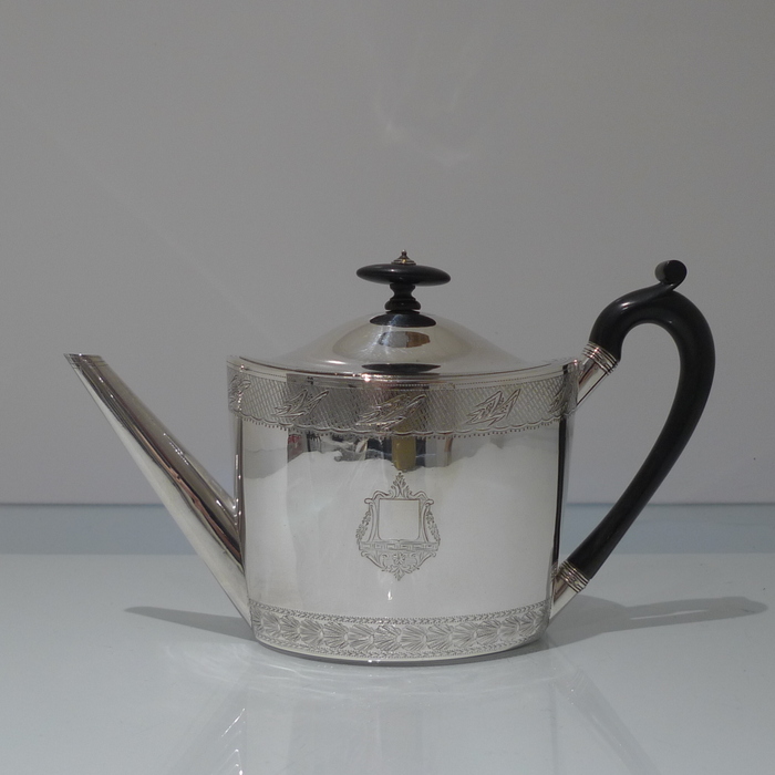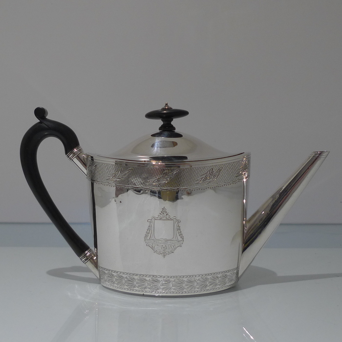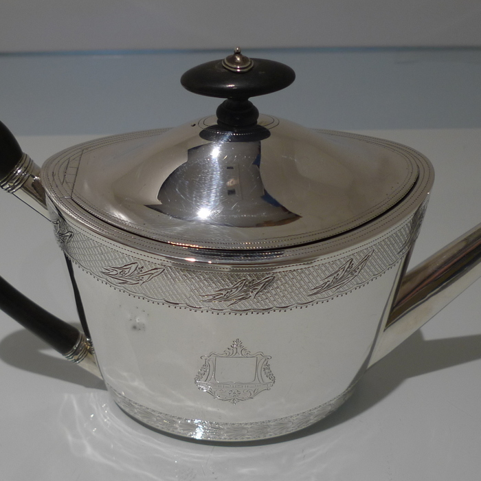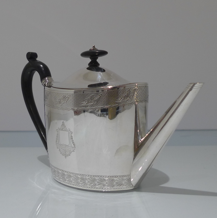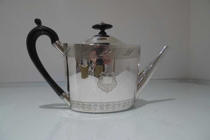 An elegant “bright cut” engraved 18th century teapot with an applied fruitwood scroll handle. Â The body has ornate upper and lower bands of engraving and a stylish double cartouche. Â The spout is the more desirable “straight” formed design and the lid of the pot is hinged.