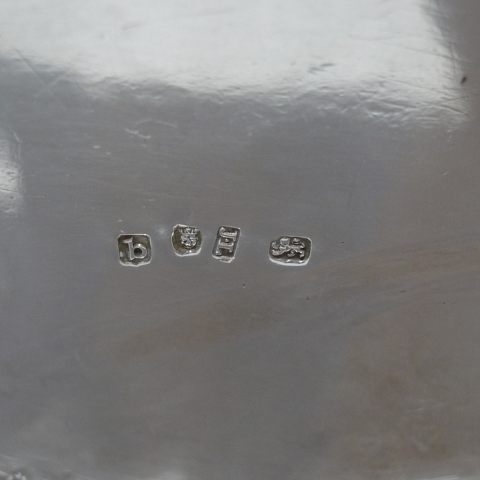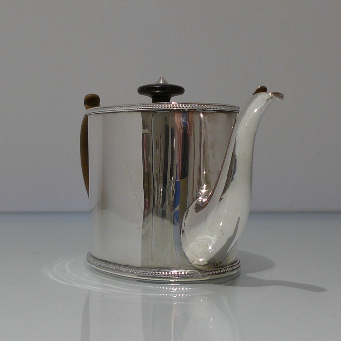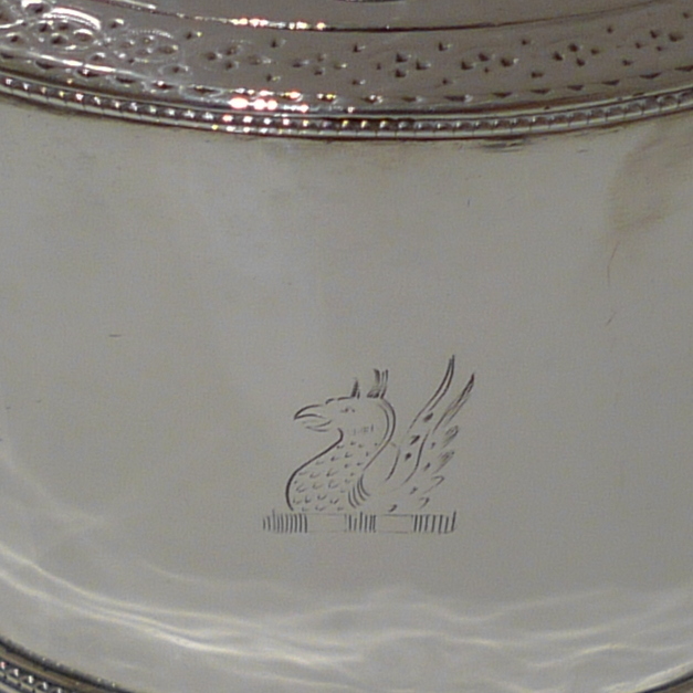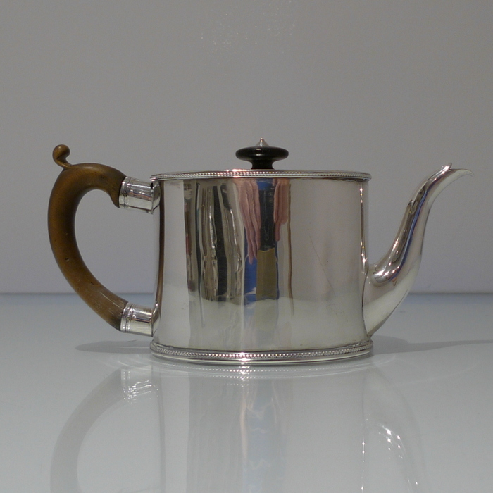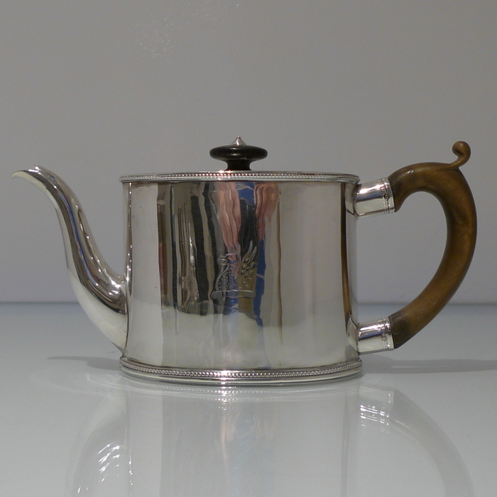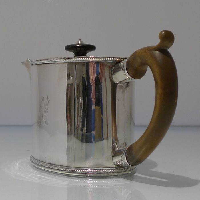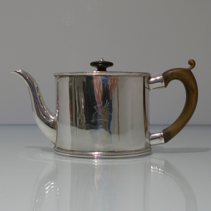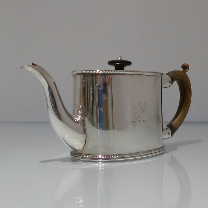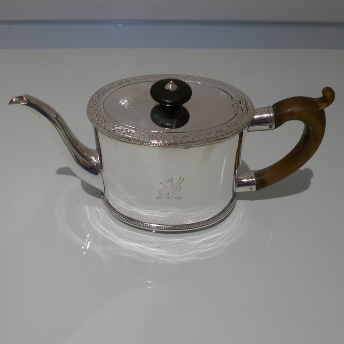 A beautiful 18th century oval teapot with applied upper and lower bead borders. Â The lid is hinged and has an outer intricate bright cut engraved outer gallery for highlights. Â The handle is scroll formed and there is a stylish contemporary crest for importance.