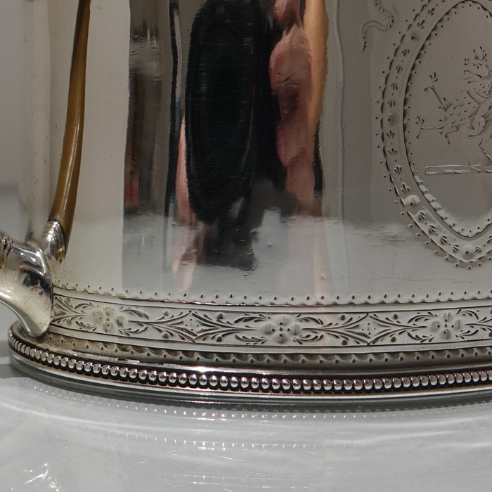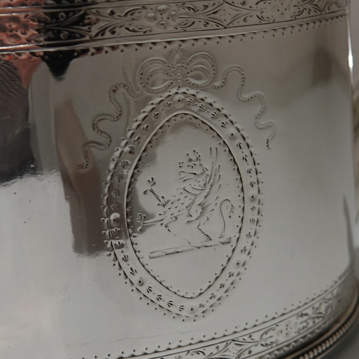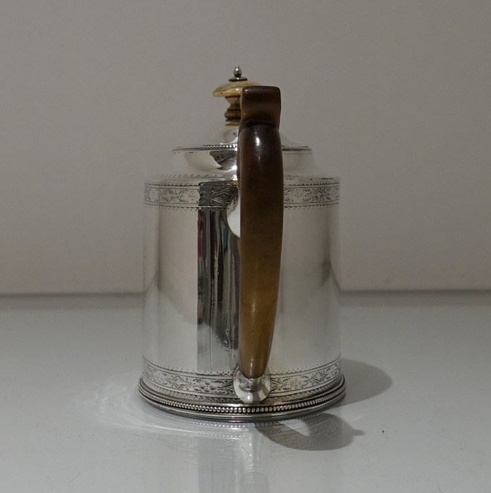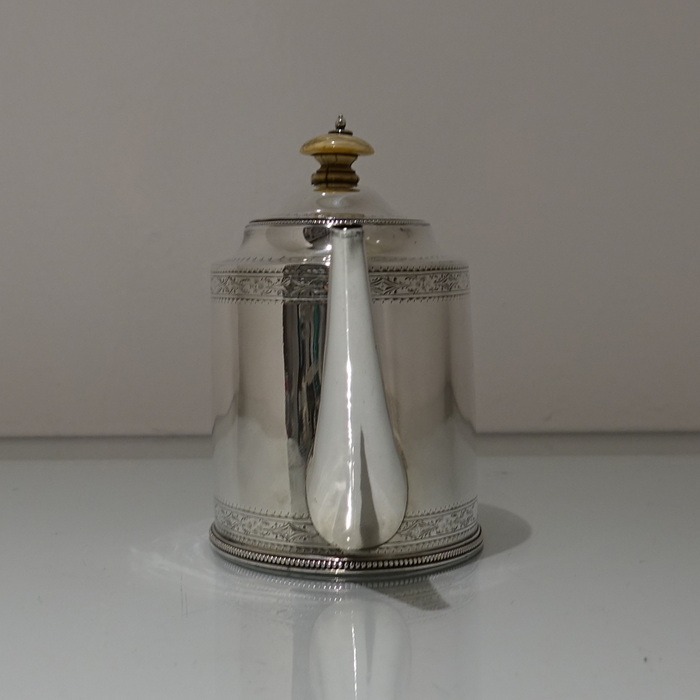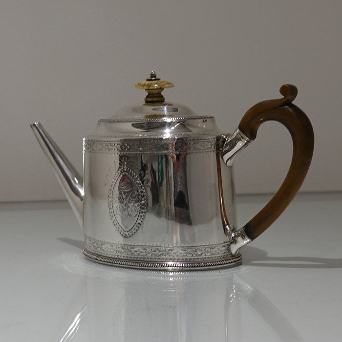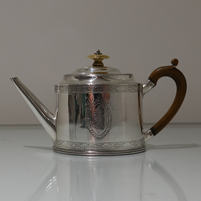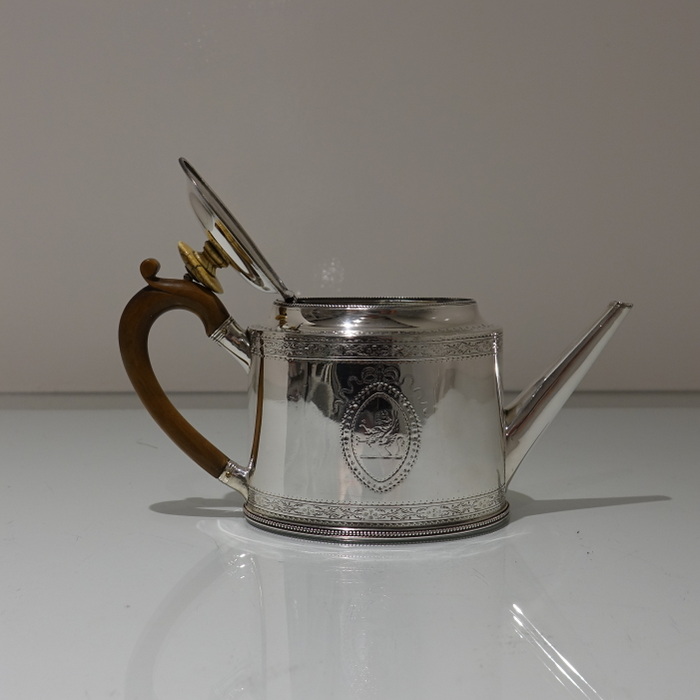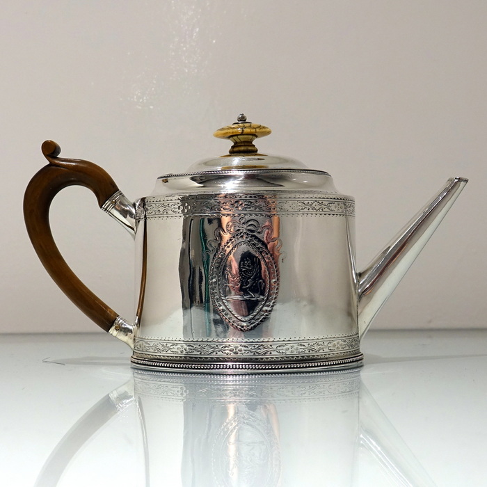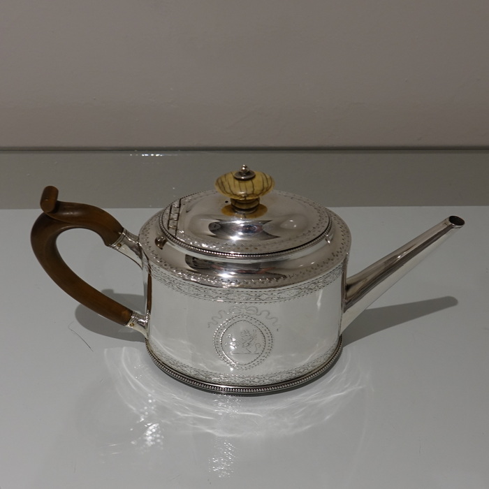 A highly collectable two band bright cut engraved oval teapot with applied upper and lower bead wires. Â The spout is the highly desirable “straight” style and the fruit wood handle is scroll formed. Â Both sides of the body have elegant oval cartouches in which sits contemporary initials and armorial for importance.