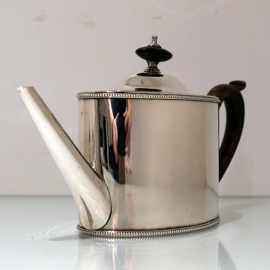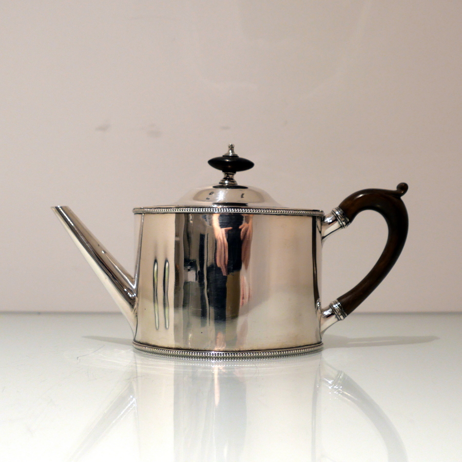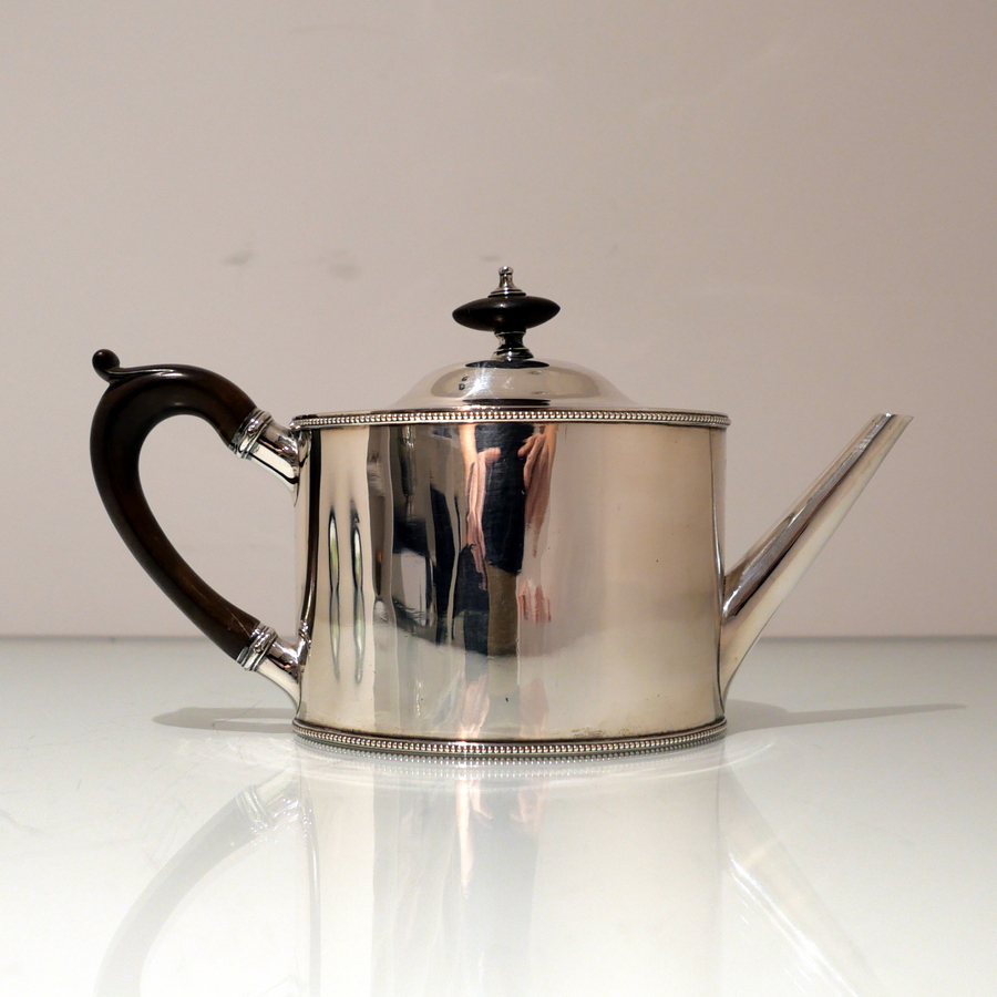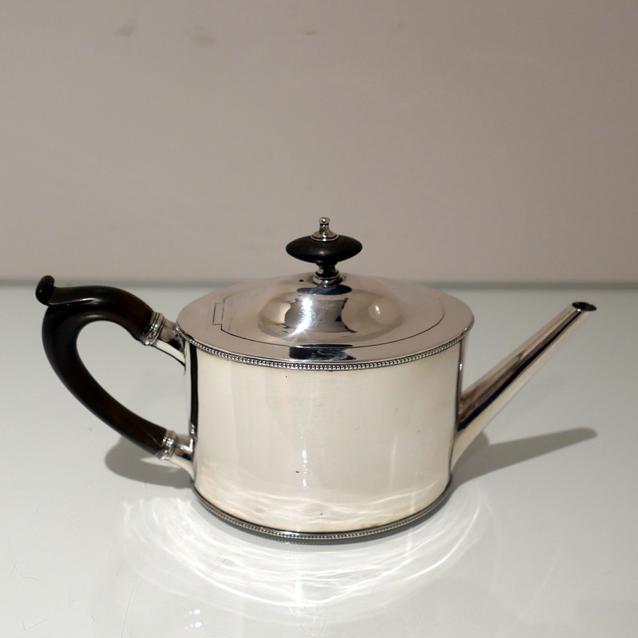 A beautiful oval bead decorated Georgian silver teapot designed with a highly desirable straight spout and a fruitwood scroll handle.