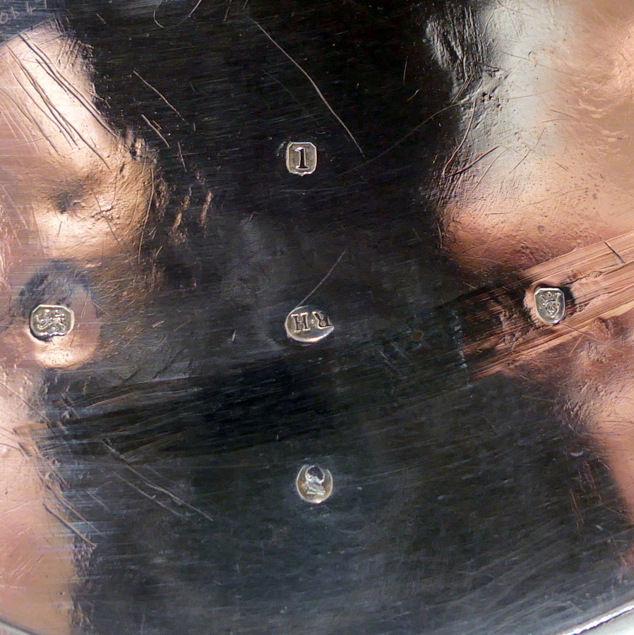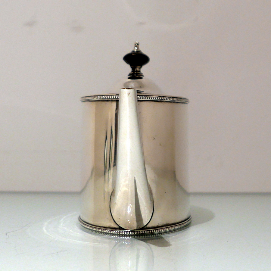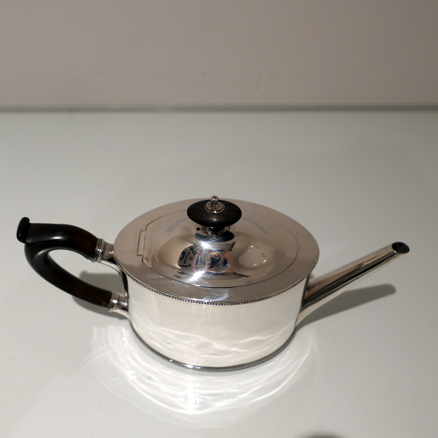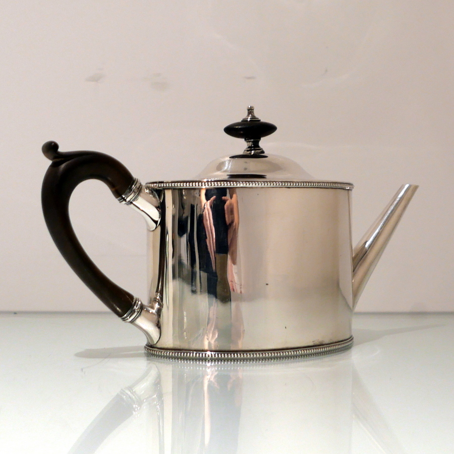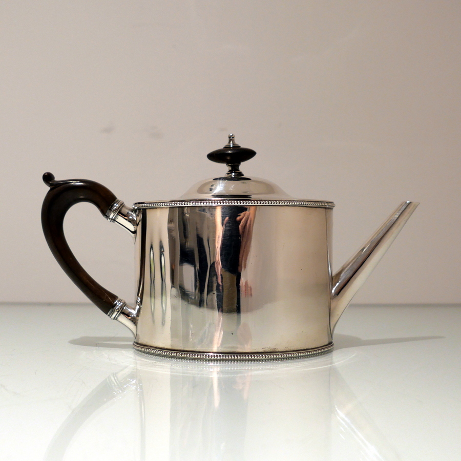 A beautiful oval bead decorated Georgian silver teapot designed with a highly desirable straight spout and a fruitwood scroll handle.