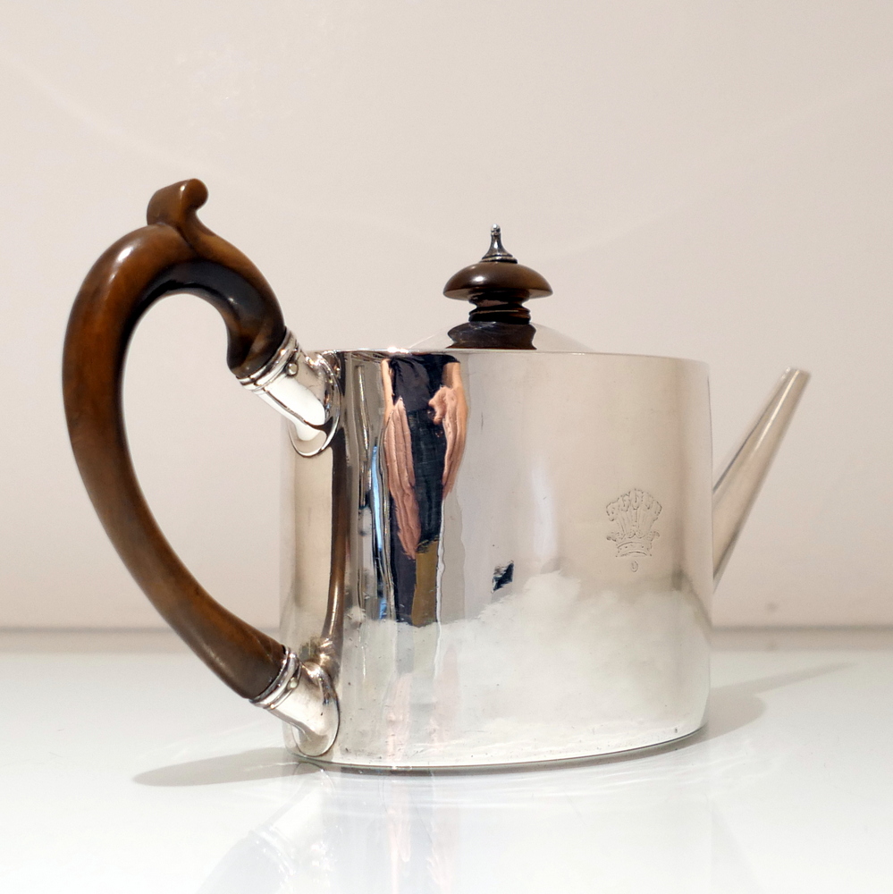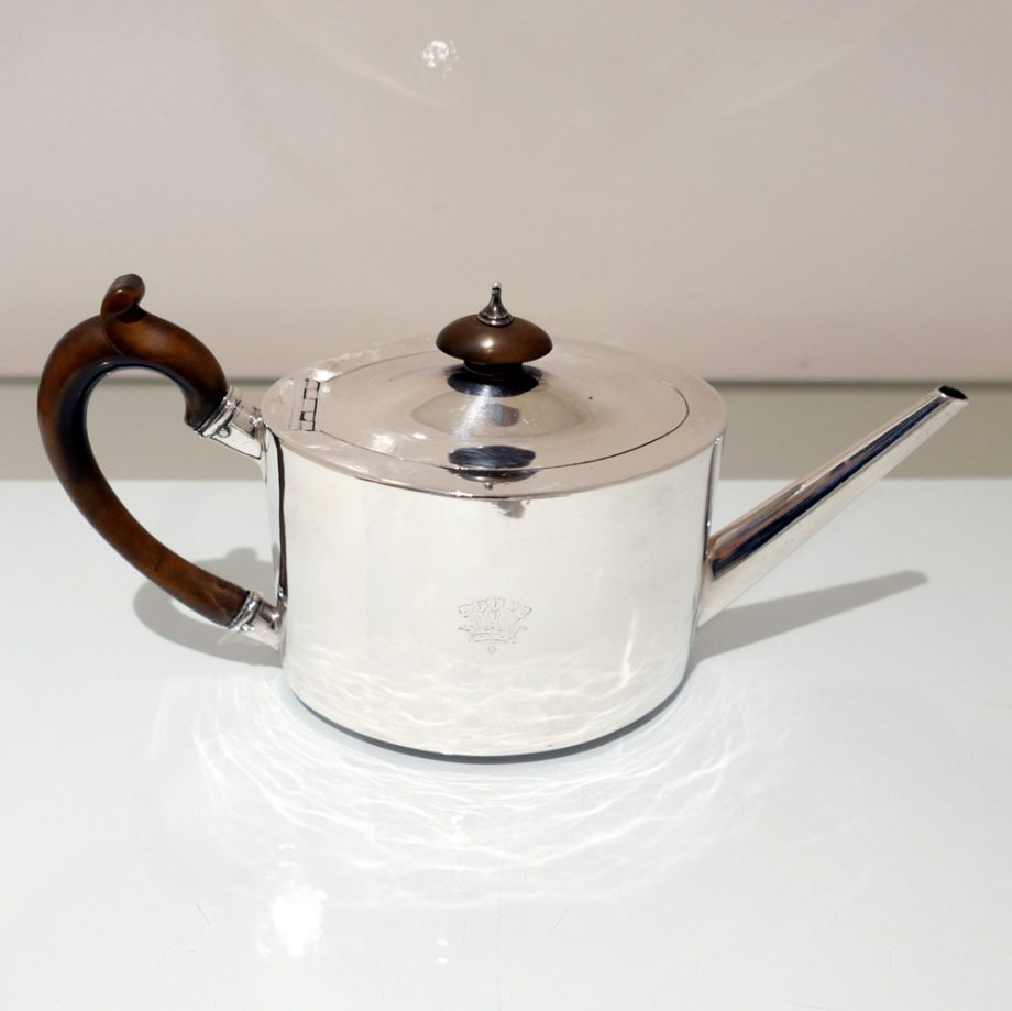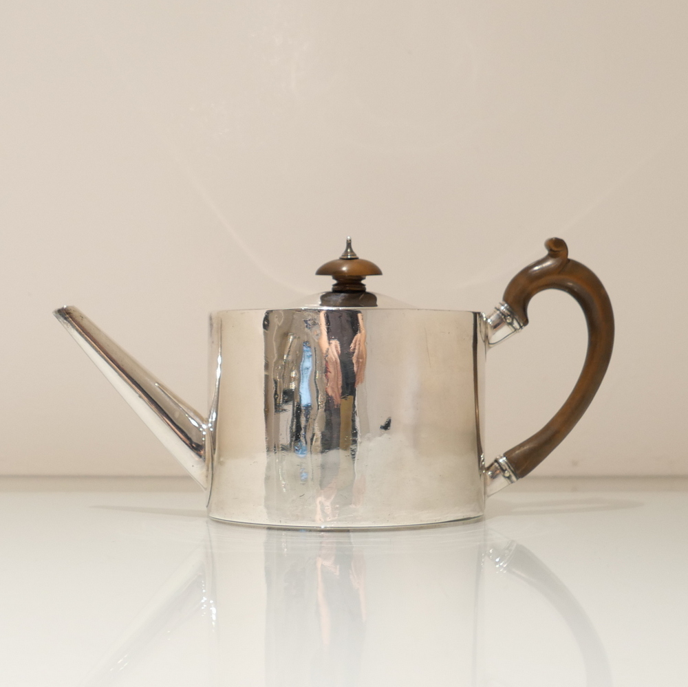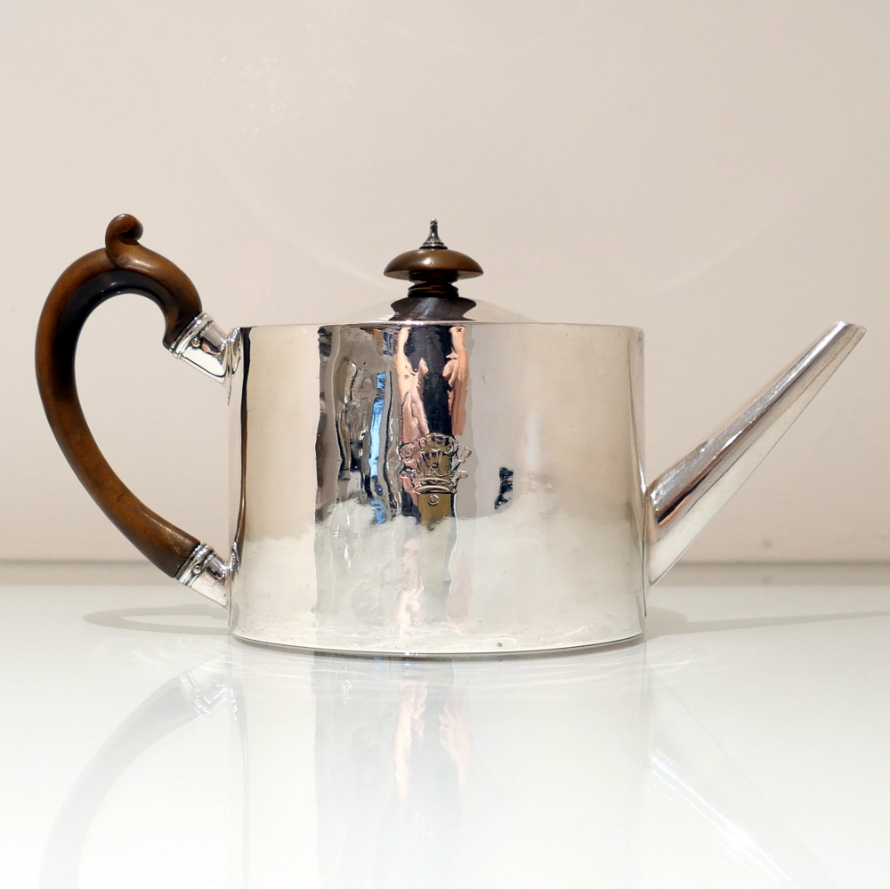 A beautiful plain formed 18th century oval flush hinged teapot with an applied fruitwood scroll handle. Â The centre front of the body has a contemporary crest for importance and the spout is the highly desirable “straight” formed.