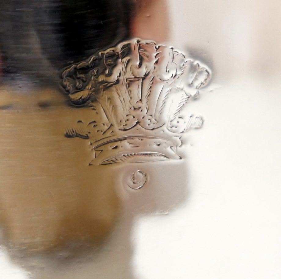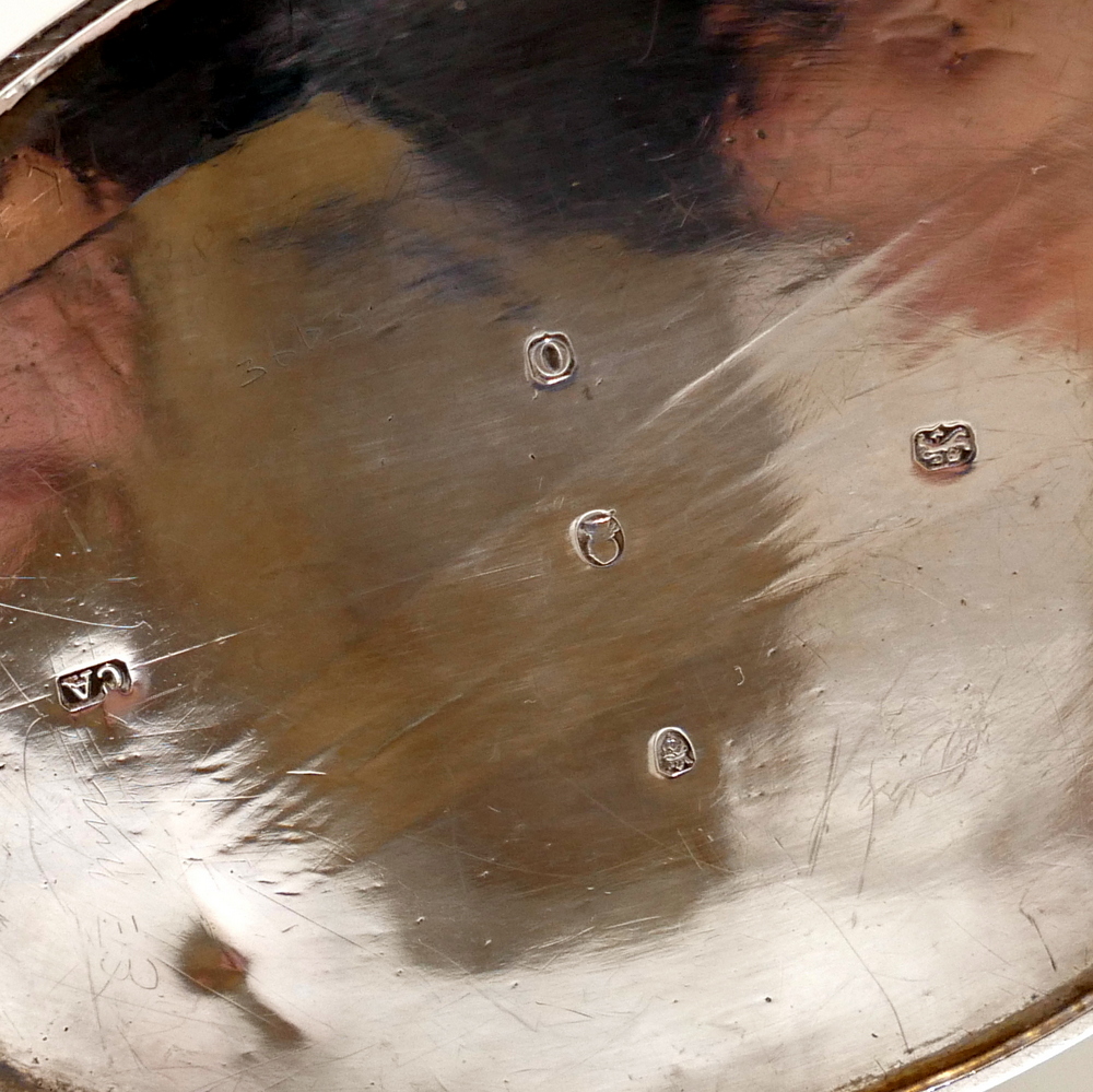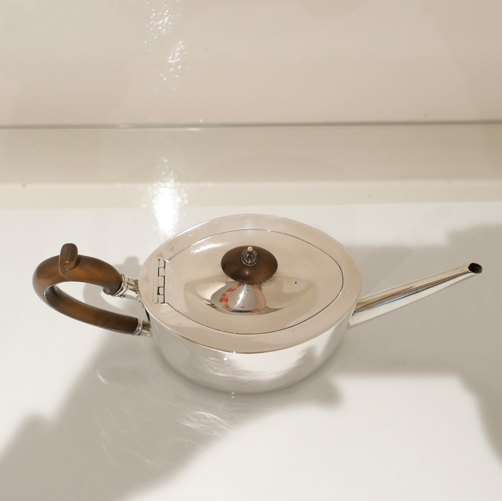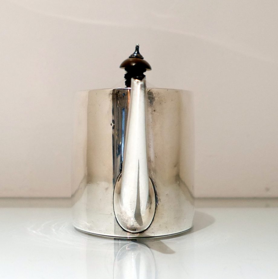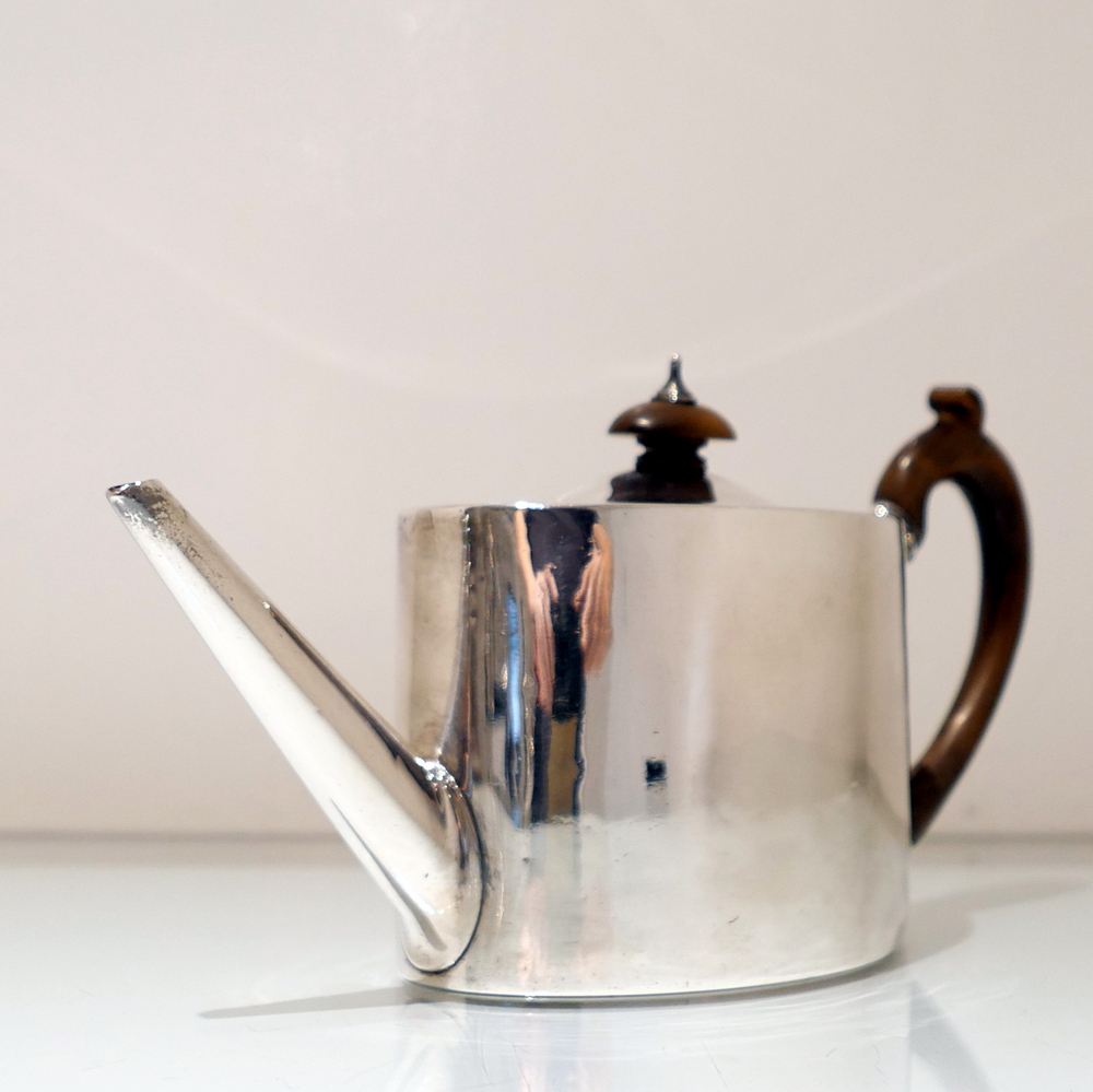 A beautiful plain formed 18th century oval flush hinged teapot with an applied fruitwood scroll handle. Â The centre front of the body has a contemporary crest for importance and the spout is the highly desirable “straight” formed.