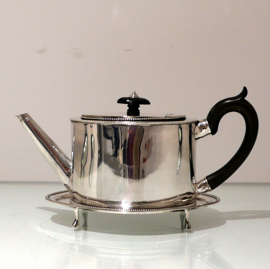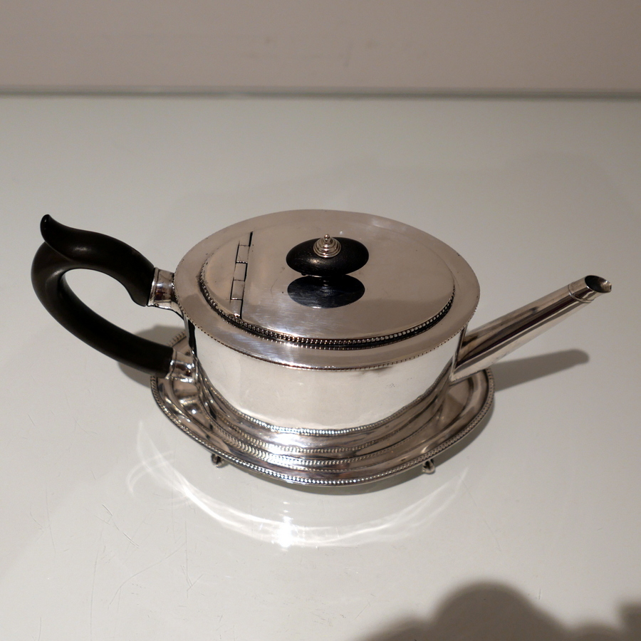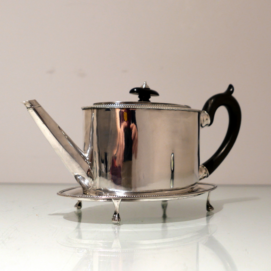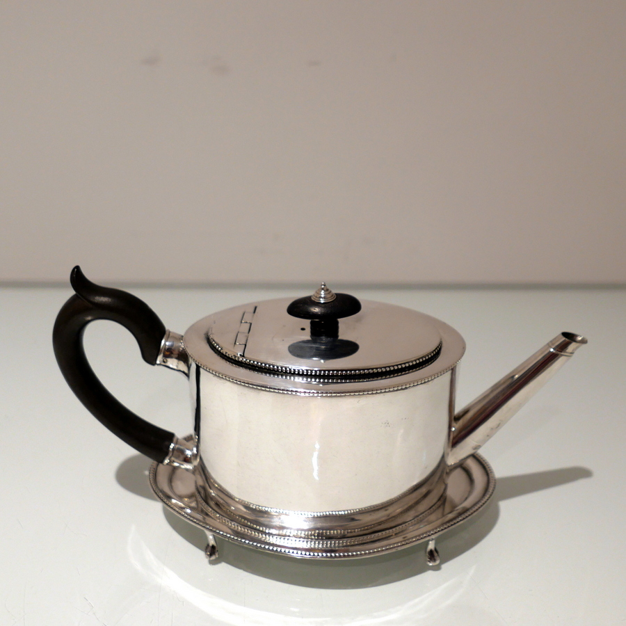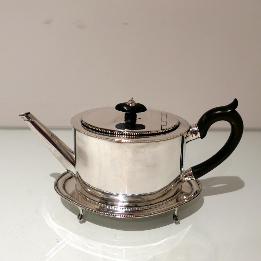 A rare and highly collectable Georgian silver teapot on stand decorated with stylish bead borders for highlights and a scroll formed fruitwood handle.