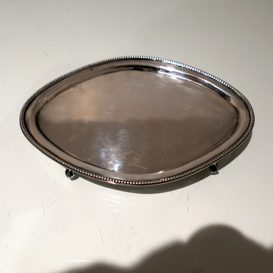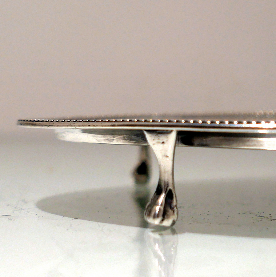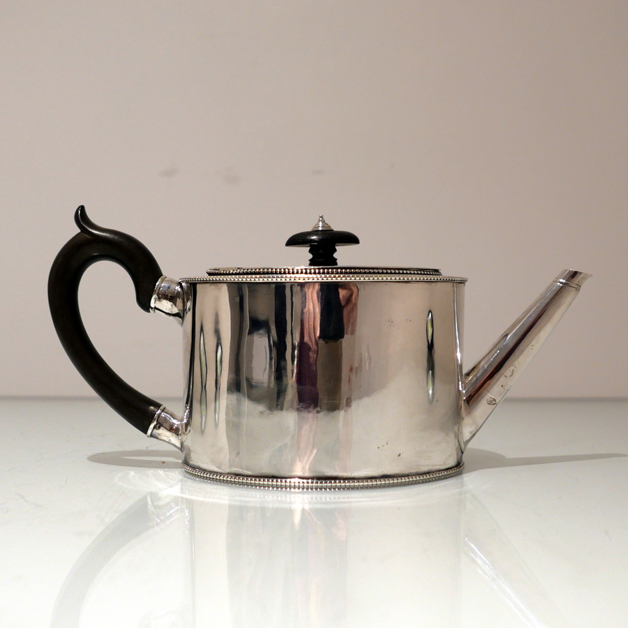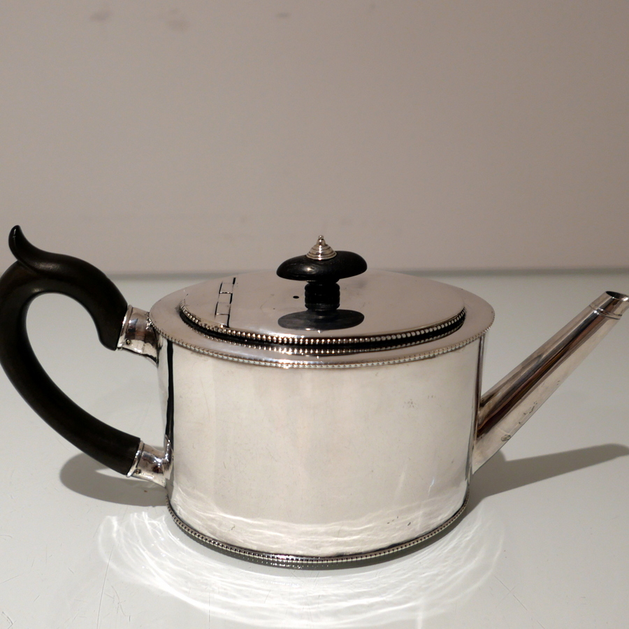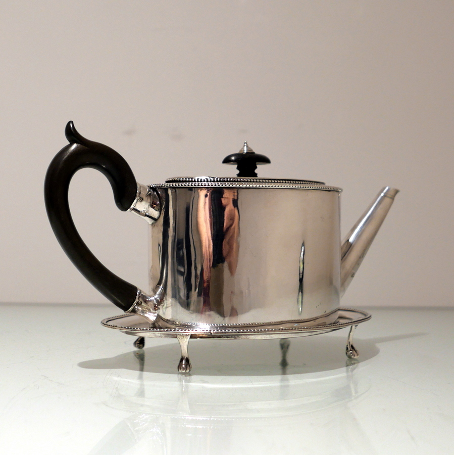 A rare and highly collectable Georgian silver teapot on stand decorated with stylish bead borders for highlights and a scroll formed fruitwood handle.