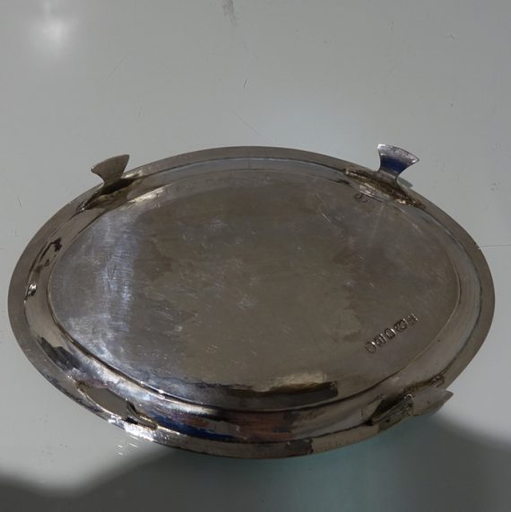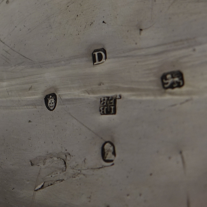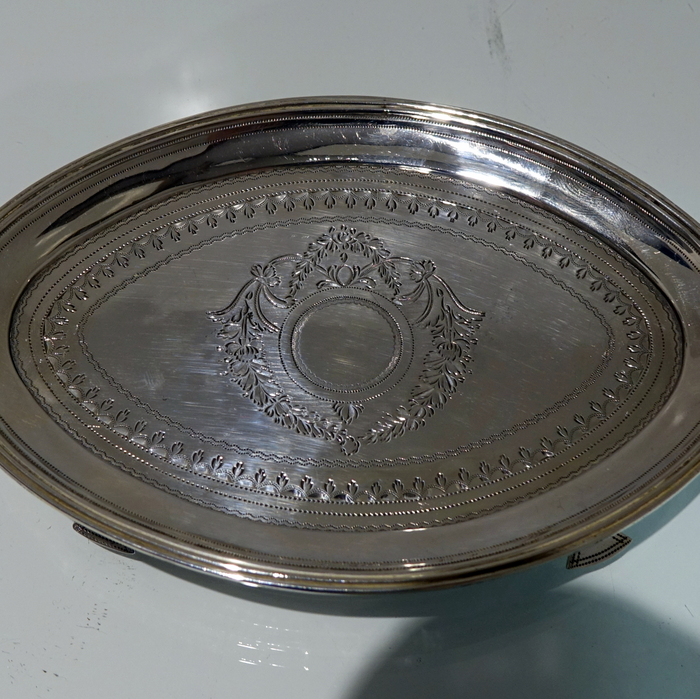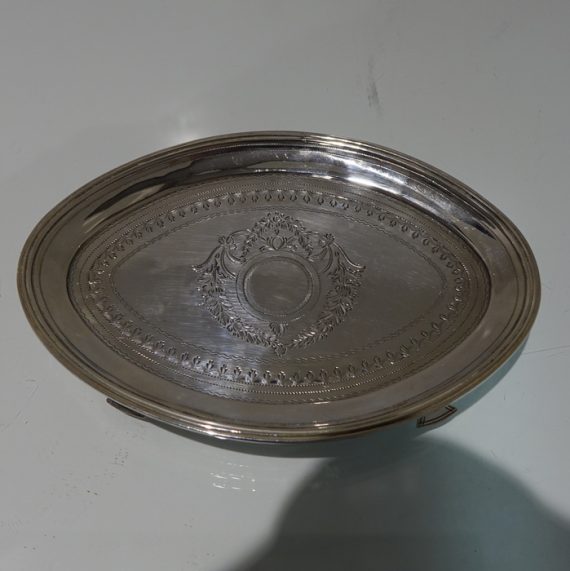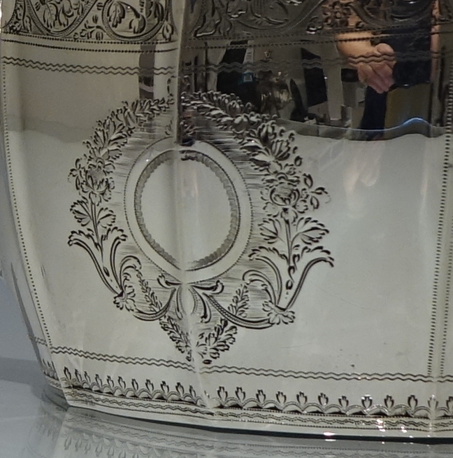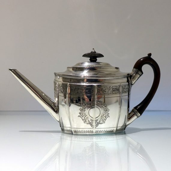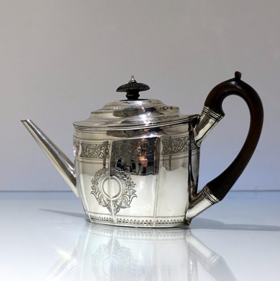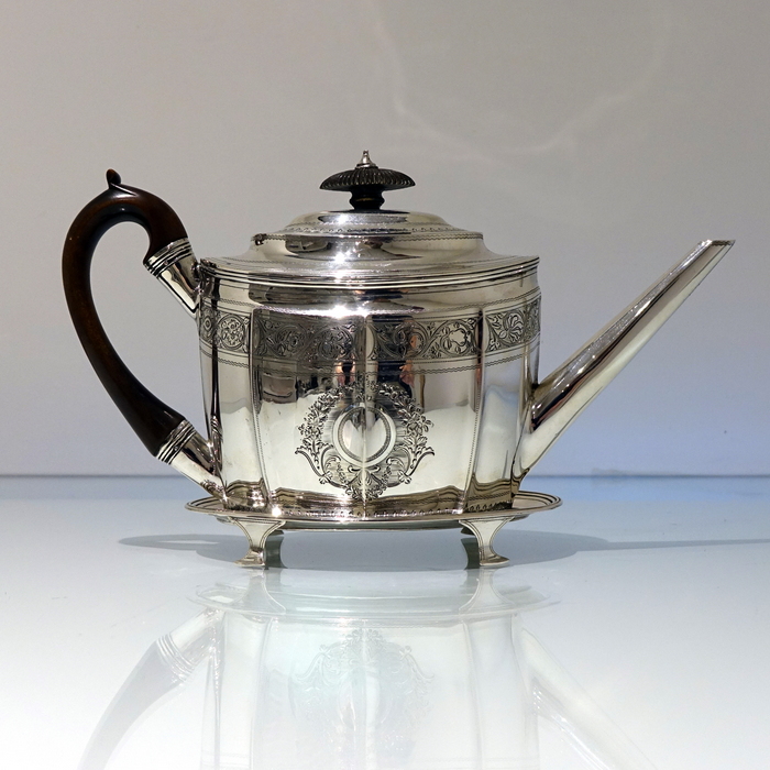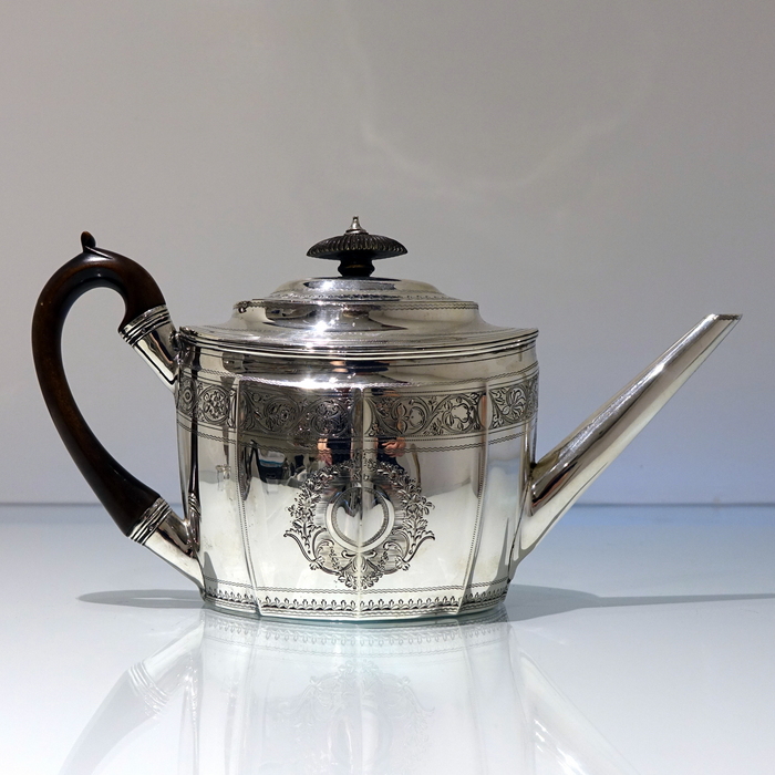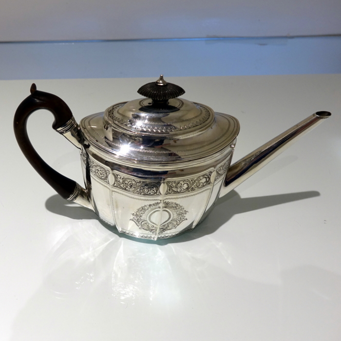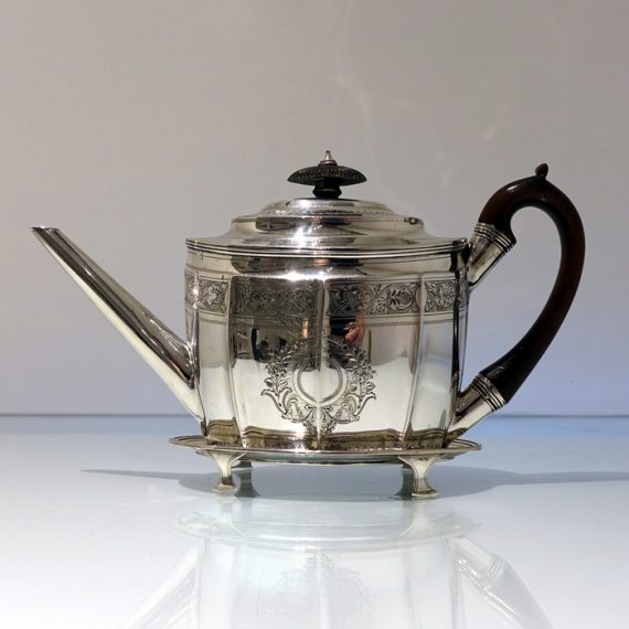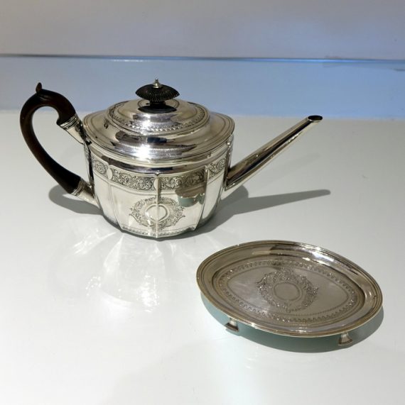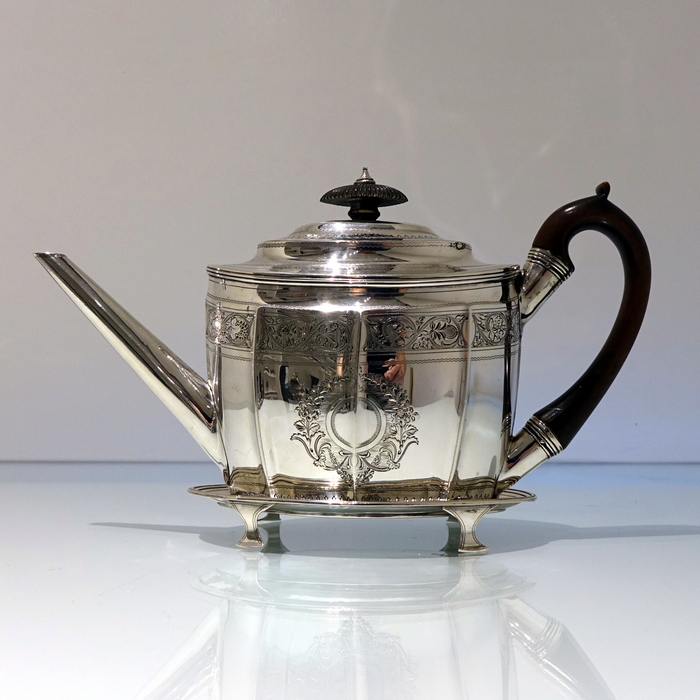 An elegant late 18th century oval bright cut engraved teapot on stand with fruitwood scroll handle and ornate double cartouches for highlights. Â The lids is hinged and is crowned with a stylish finial. Â The decoration on the teapot stand mirrors the decoration on the teapot.