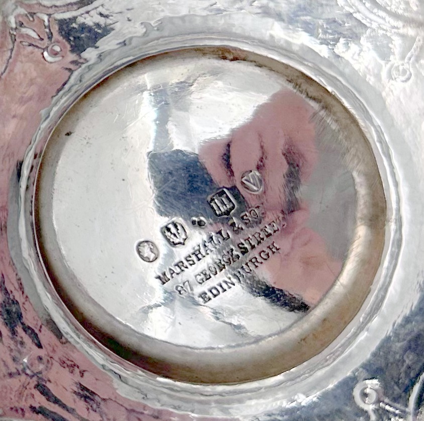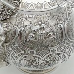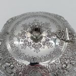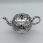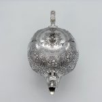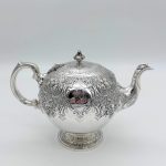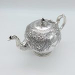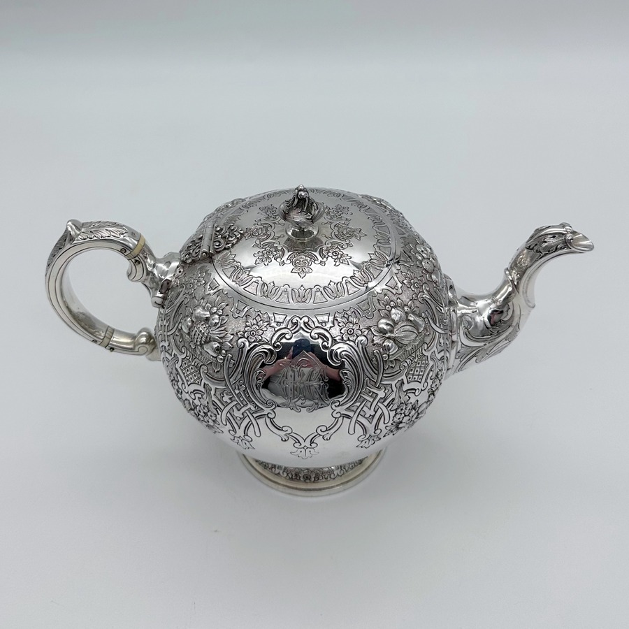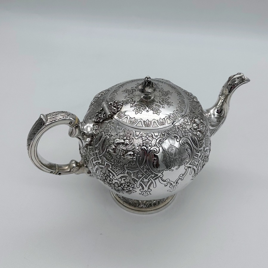 Stylish Scottish silver Victorian circular teapot decorated with elegant floral and lattice embossing which is beautifully set on a matt background for decorative visual contrast. There is an elegant entwined contemporary initial for importance.