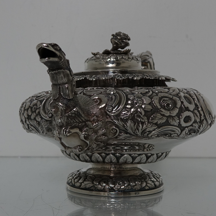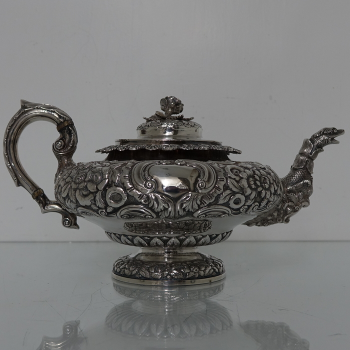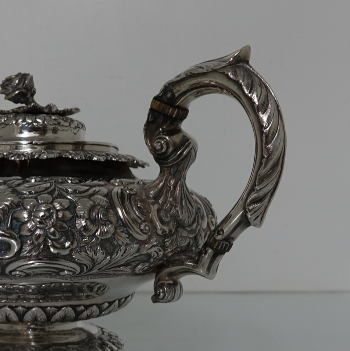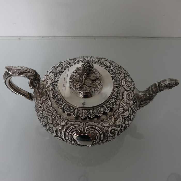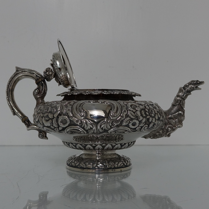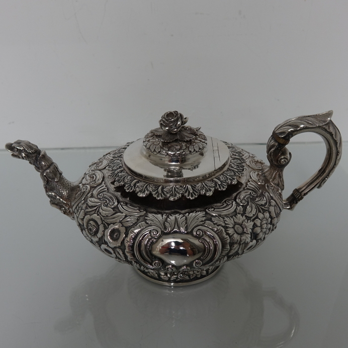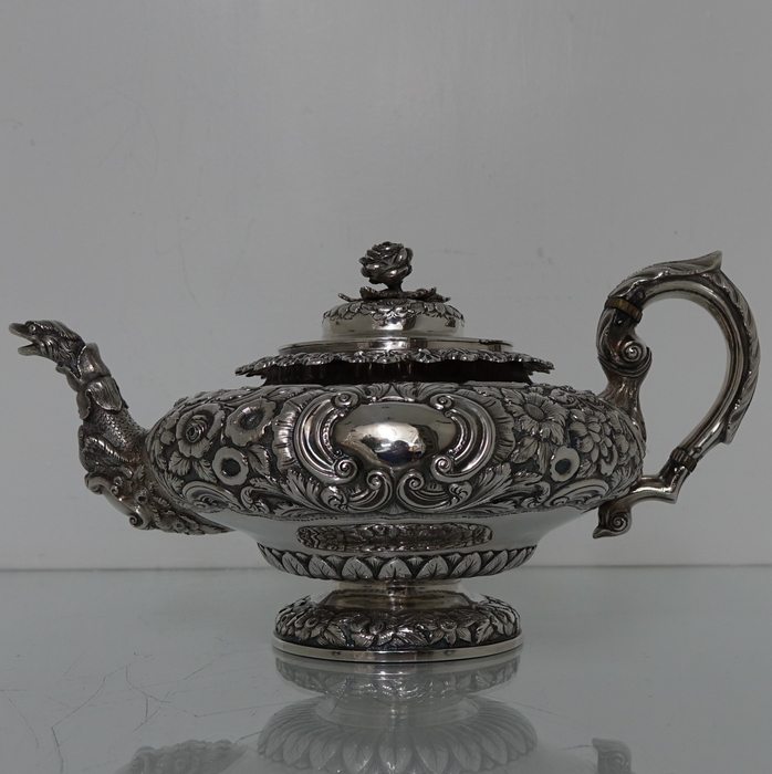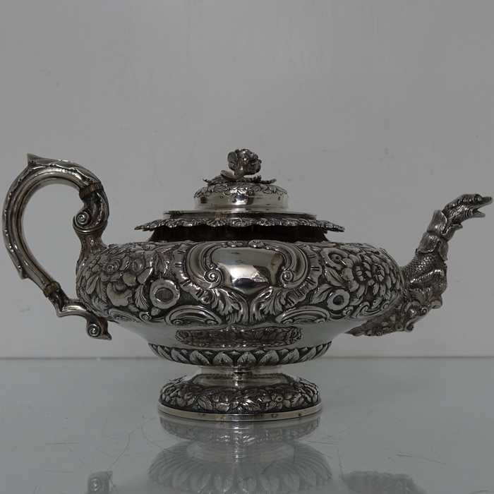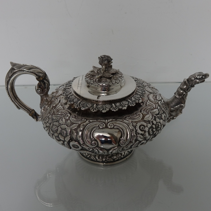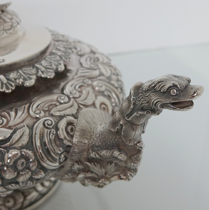 A stunningly beautiful large circular Irish silver teapot, beautifully floral embossed throughout with ornately shaped double cartouches. Â The spout of the teapot is uniquely designed with a sea serpent theme. Â The handle is scroll formed with acanthus leaf thumb piece. Â The lid is hinged and crowned with a elegant floral finial.