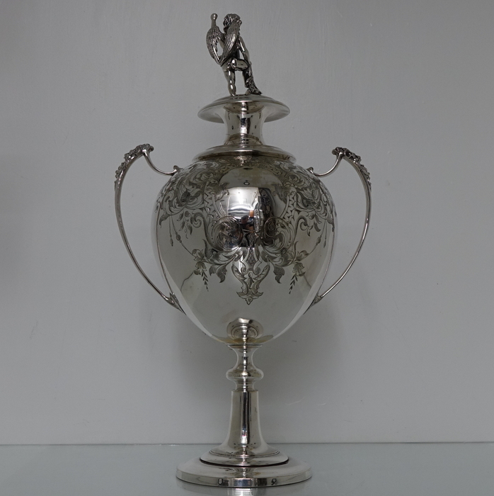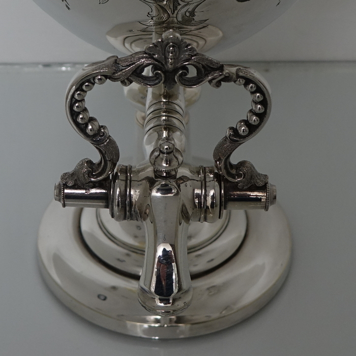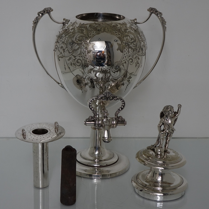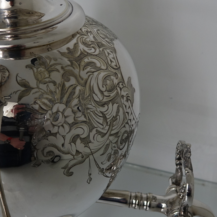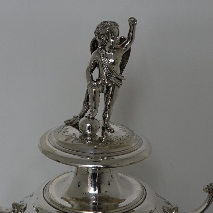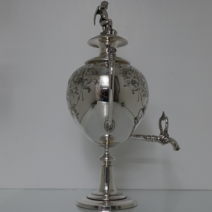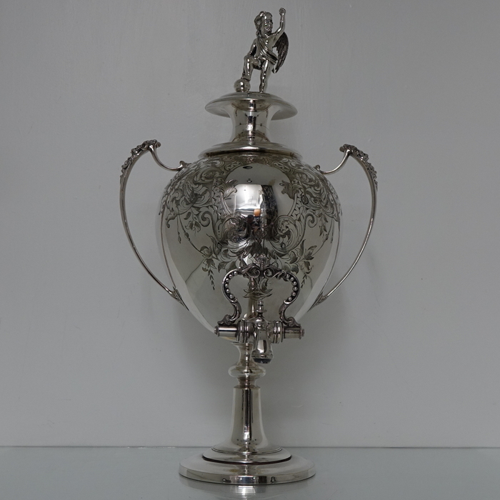 A beautiful large Victorian plate tea urn decorated with floral hand engraving entwined around a double cartouche. Â The tea urn has a detachable lid which is crowned with a delightful cherub finial. Â The foot of the tea urn is plain formed in design.