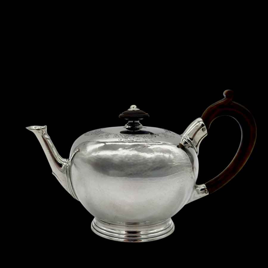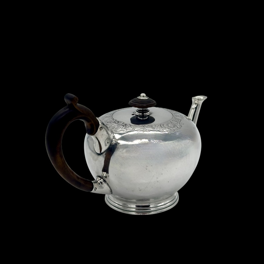 Truly delightful plain formed Georgian silver bullet teapot designed with a sumptuous curvaceous body and decorated with a beautiful flat chased gallery surrounding the flush hinged lid.