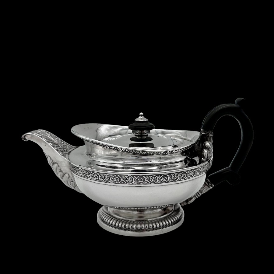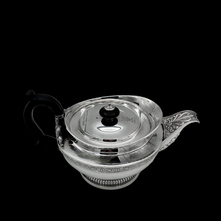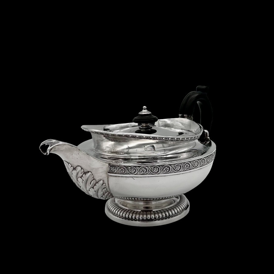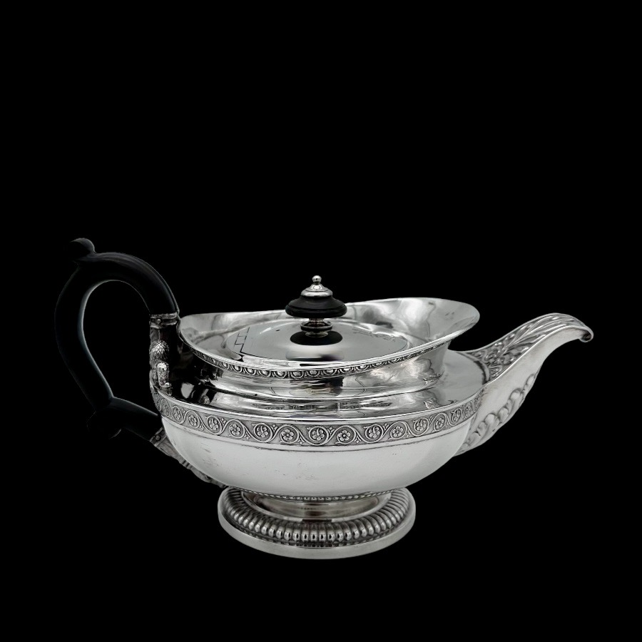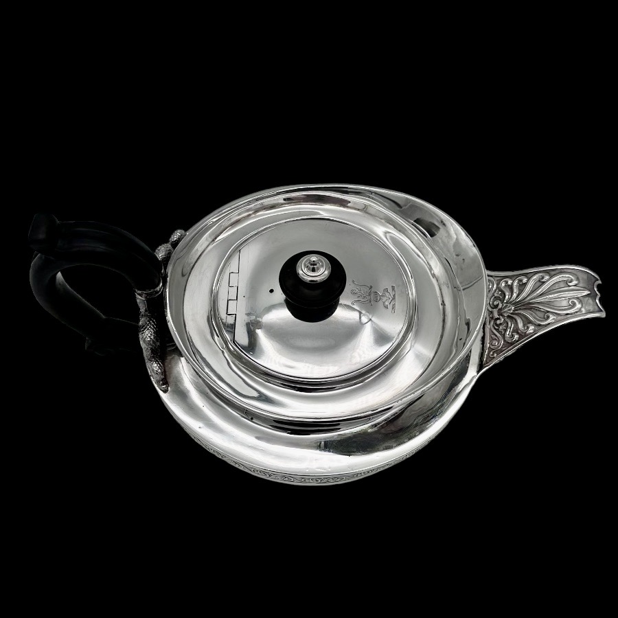 Stylish lamp formed Georgian silver teapot decorated with an elegant applied scrolling floral gallery band and sitting on a circular lobed decorated foot. There is a wonderful original crest for importance.