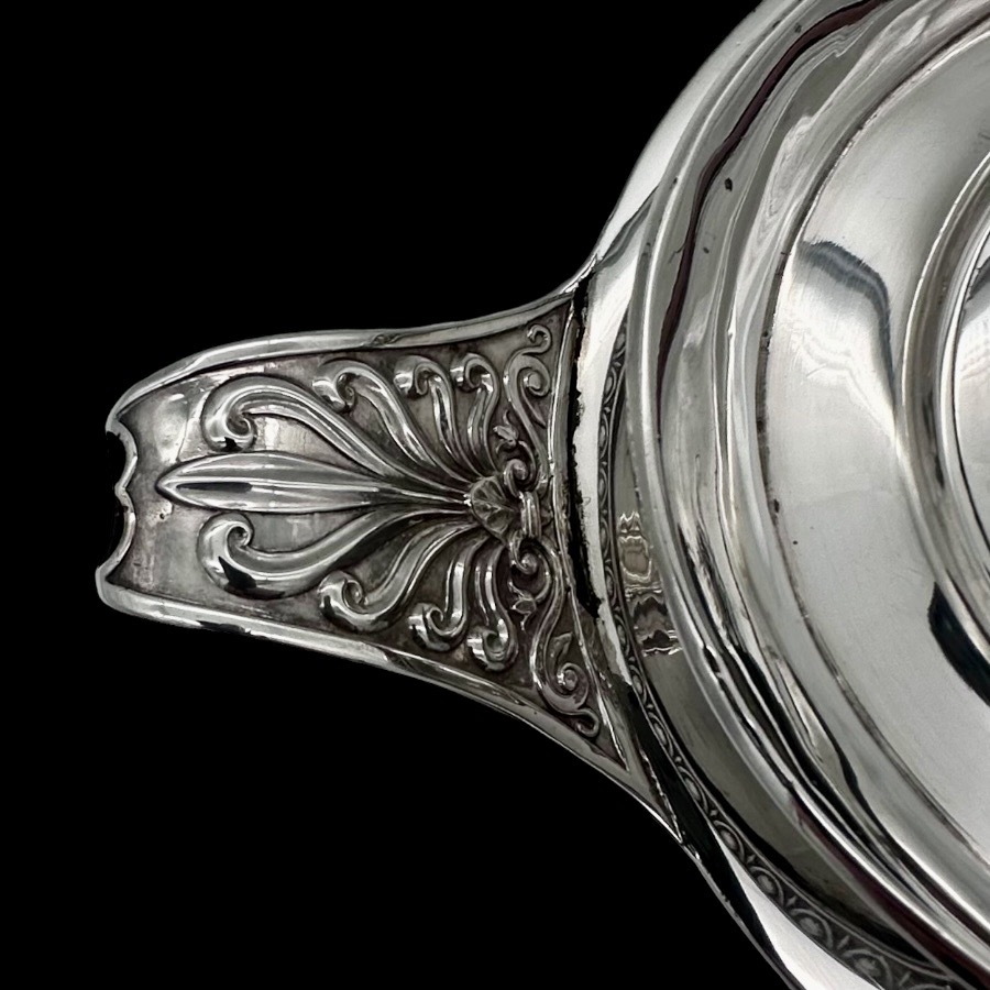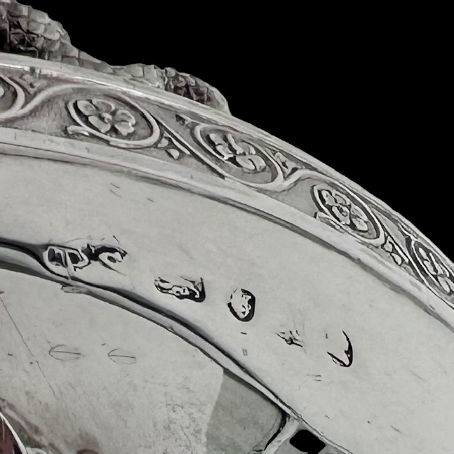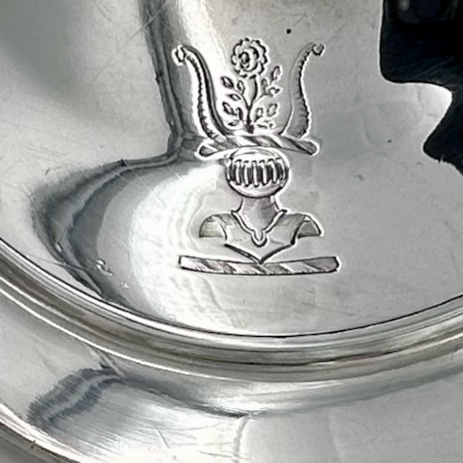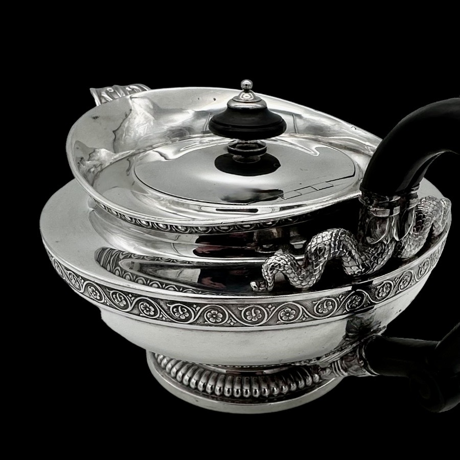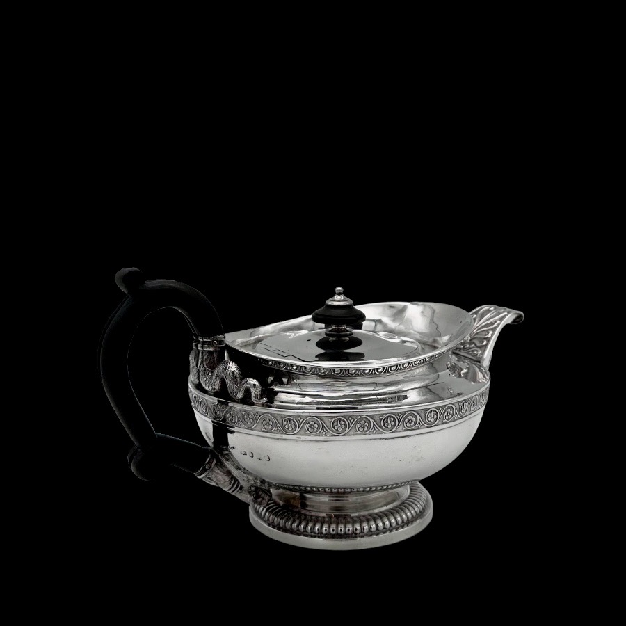 Stylish lamp formed Georgian silver teapot decorated with an elegant applied scrolling floral gallery band and sitting on a circular lobed decorated foot. There is a wonderful original crest for importance.