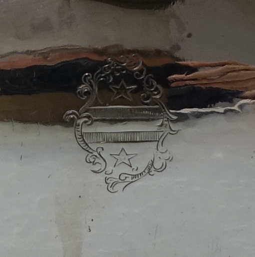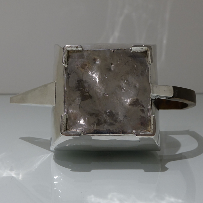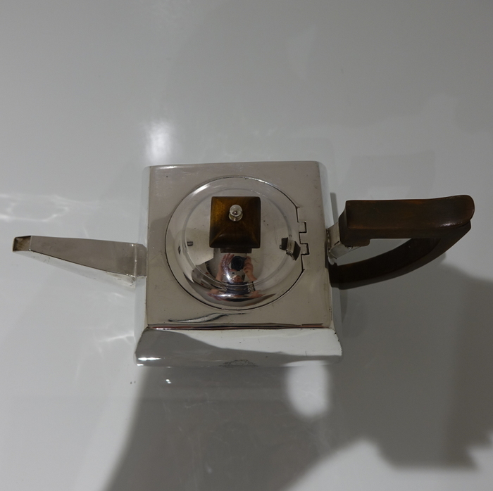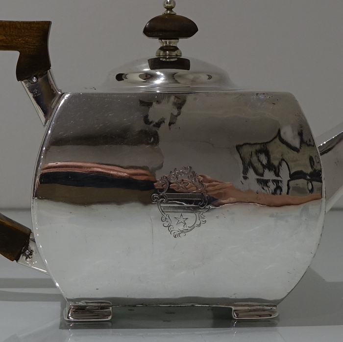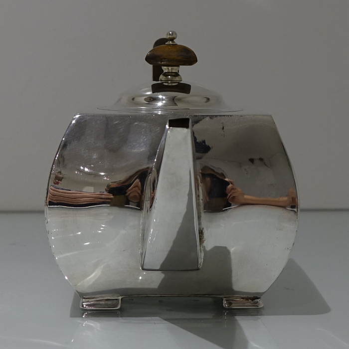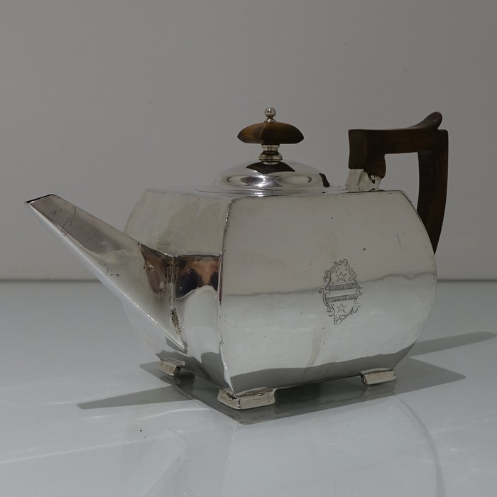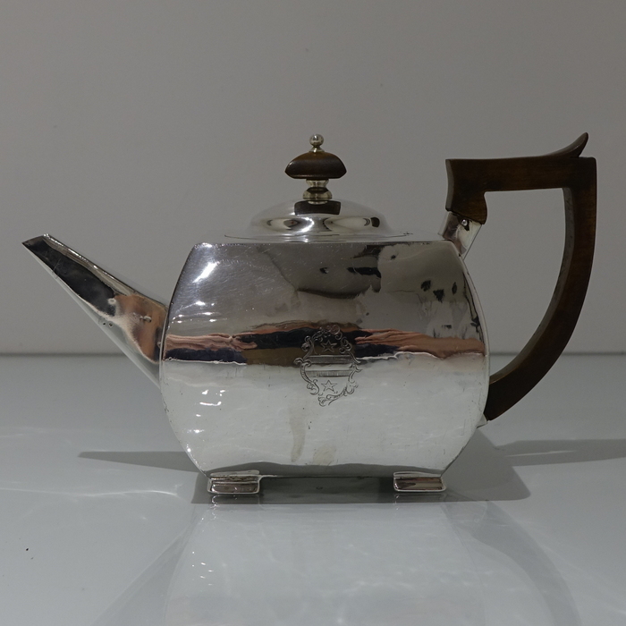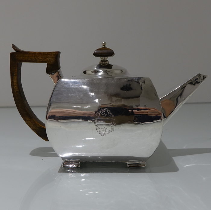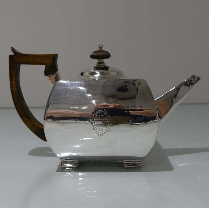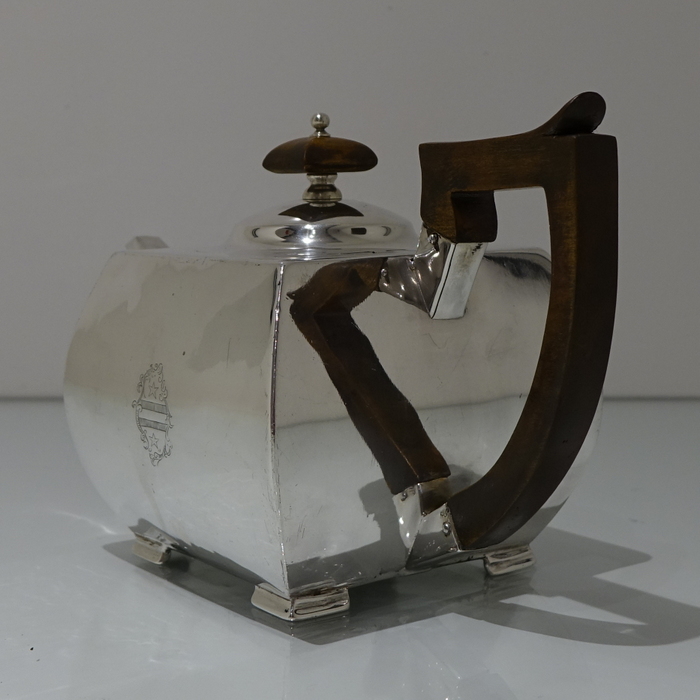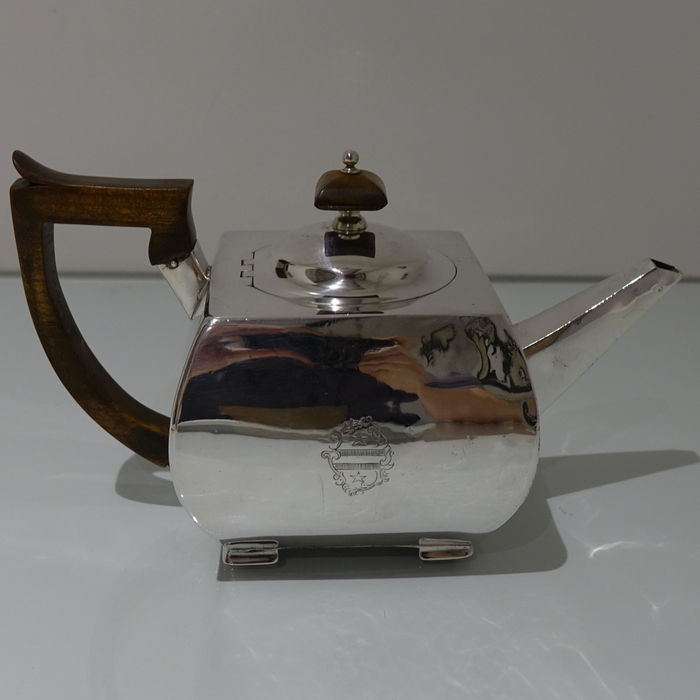 A rare and extremely stylish square shaped teapot with slight bulbous design to the body, the handle and finial are stylishly formed in fruit wood and the teapot itself sits on four elegant bracket feet. Â There is a double contemporary crest for importance.