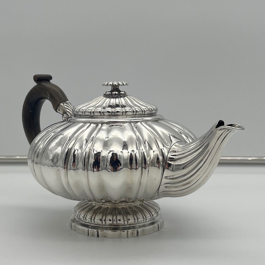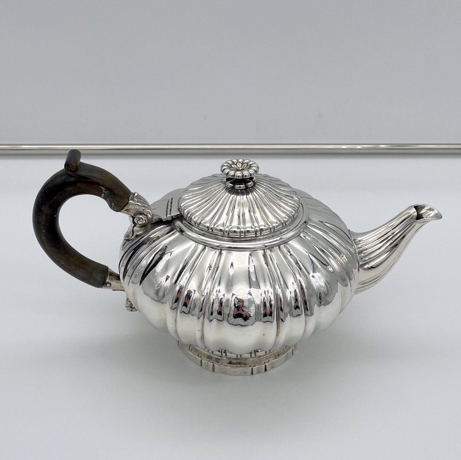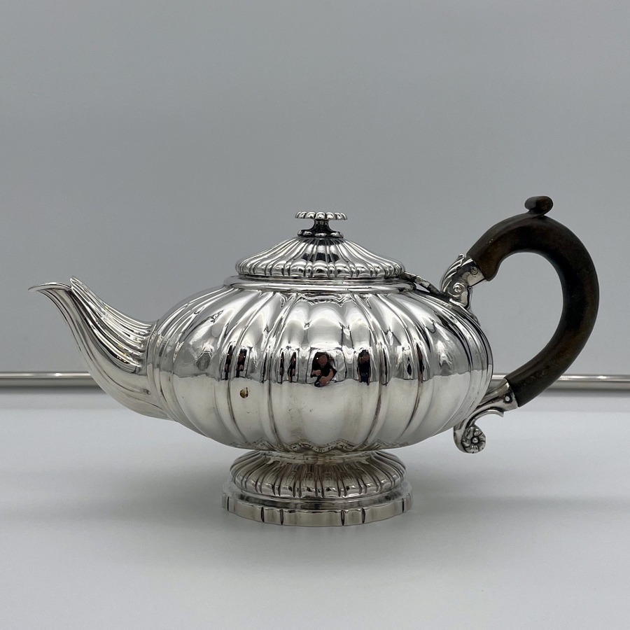 A truly wonderful and incredibly rare late Georgian silver teapot designed with a shaped circular body and decorated with delightful pumpkin style fluting throughout. The decorative lid is hinged and there is a scroll shaped fruitwood handle.
