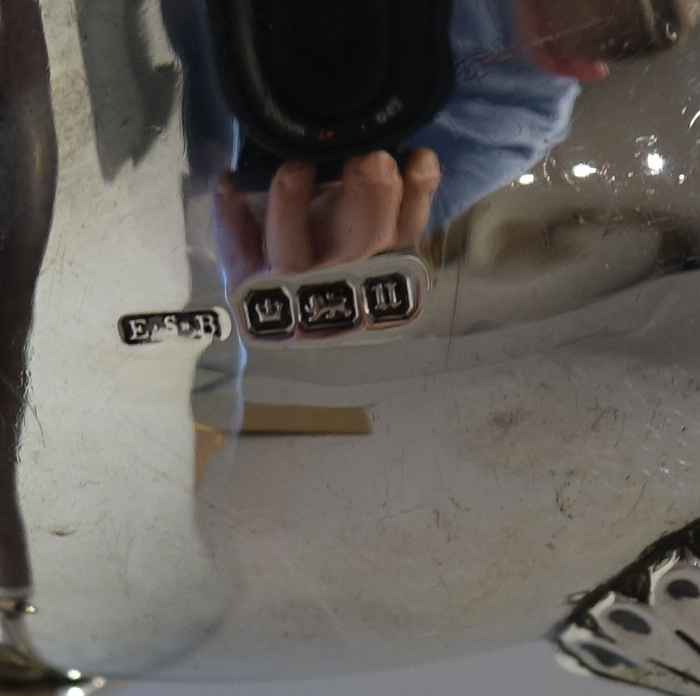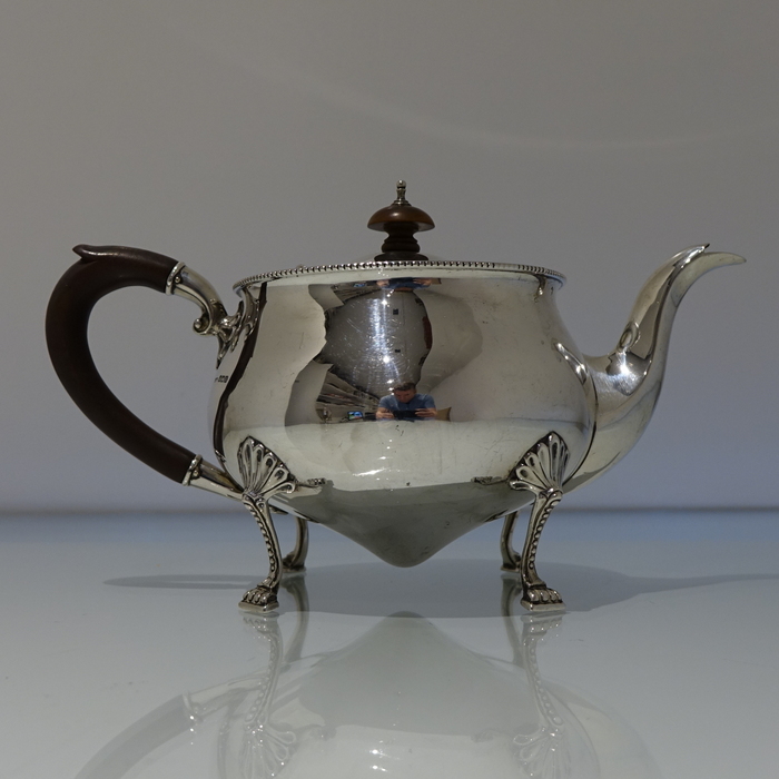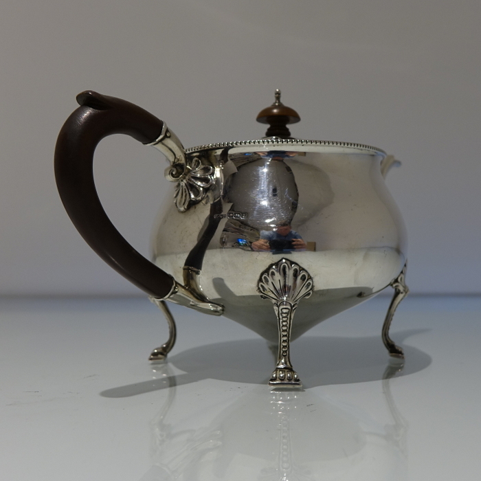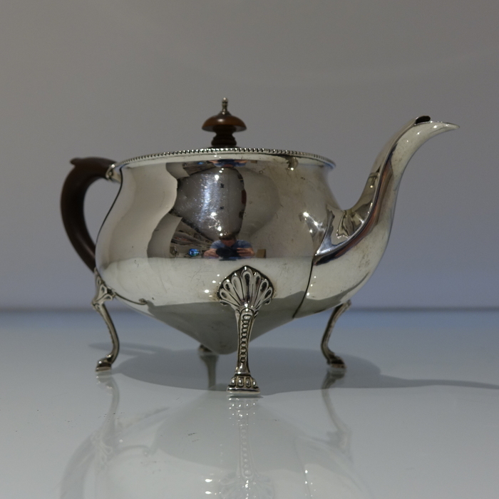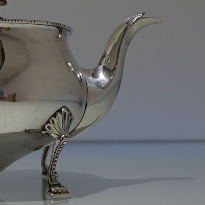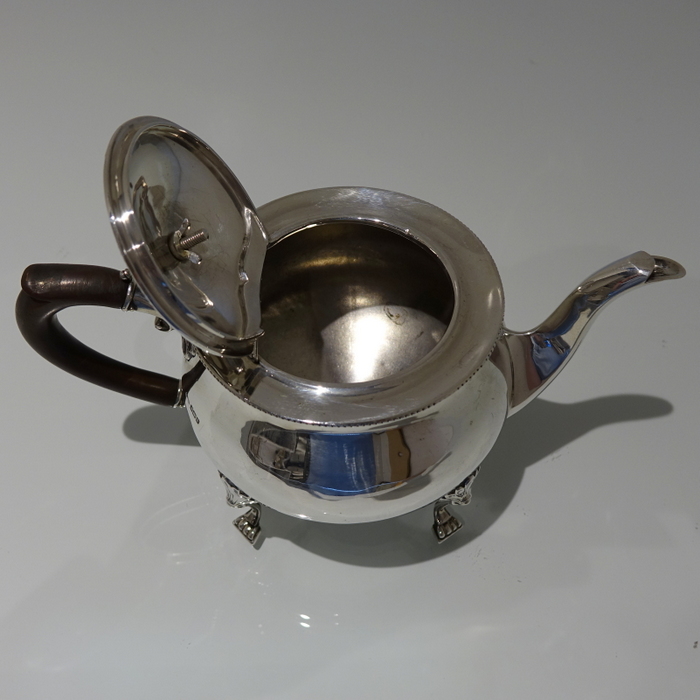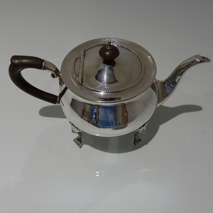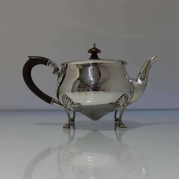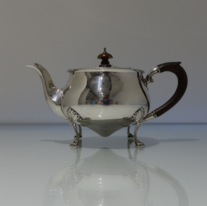 An extremely elegant and incredibly rare Art Nouveau tear drop designed teapot. Â The teapot sits on four ornate bead feet and has an ebony scroll handle. Â The lid is hinged and is crowned with a circular domed finial.