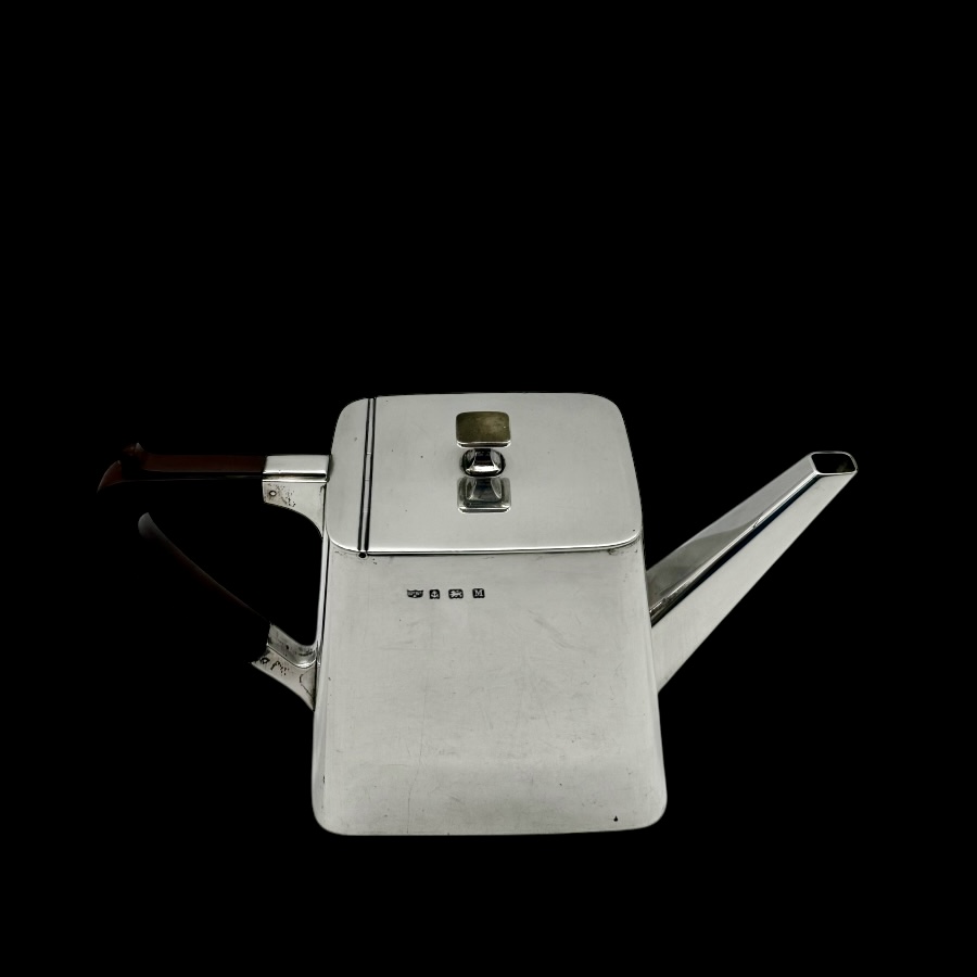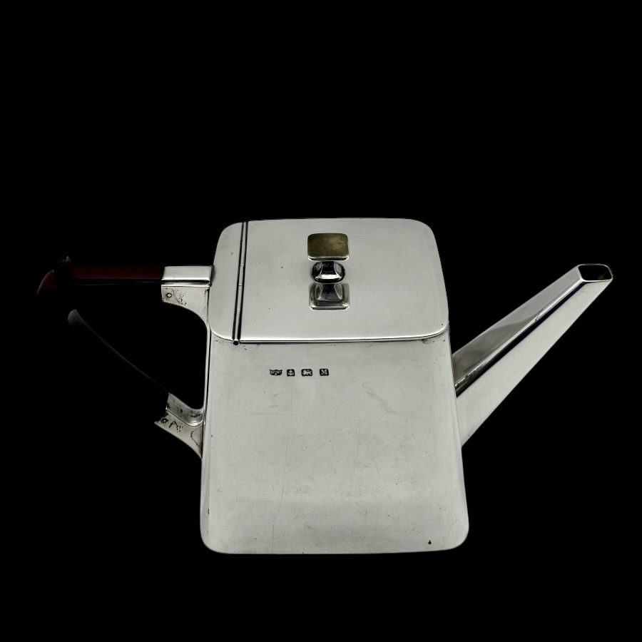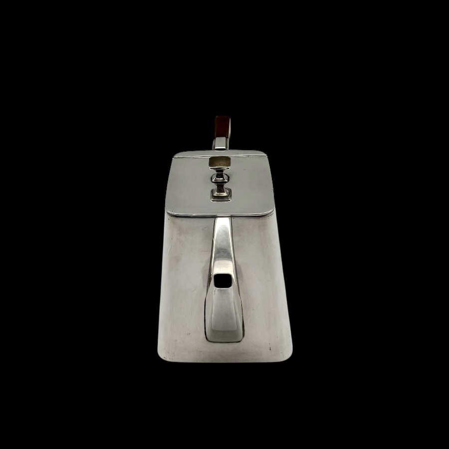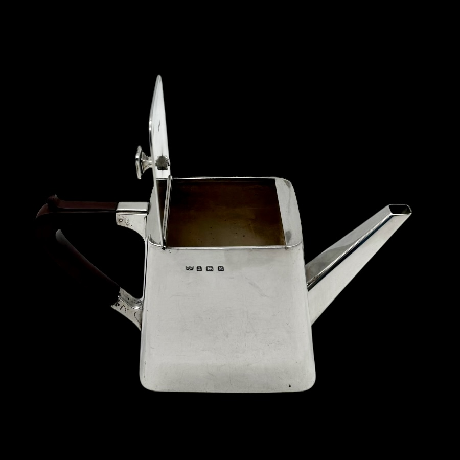 Unbelievably stylish sterling silver teapot designed with elegant tapering walls and a desirable straight spout. The lid is flush hinged and the handle is a modern take on the traditional scroll formed designs.