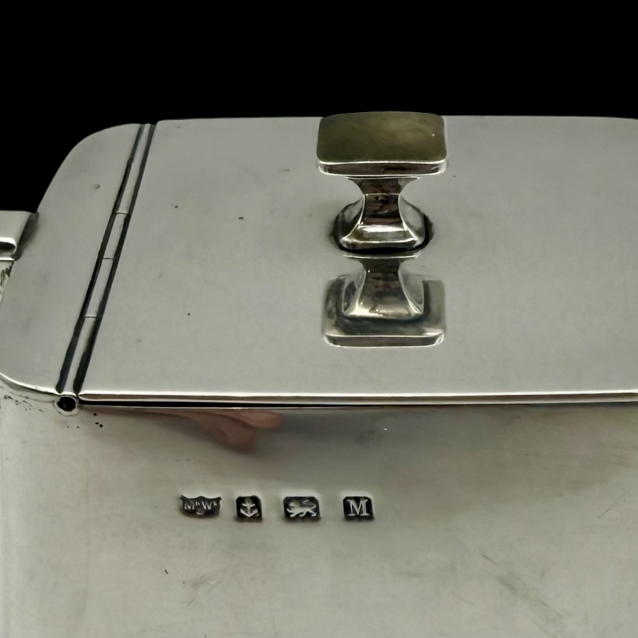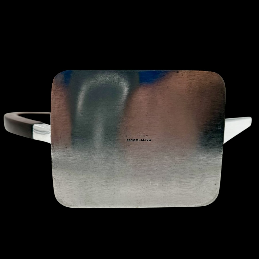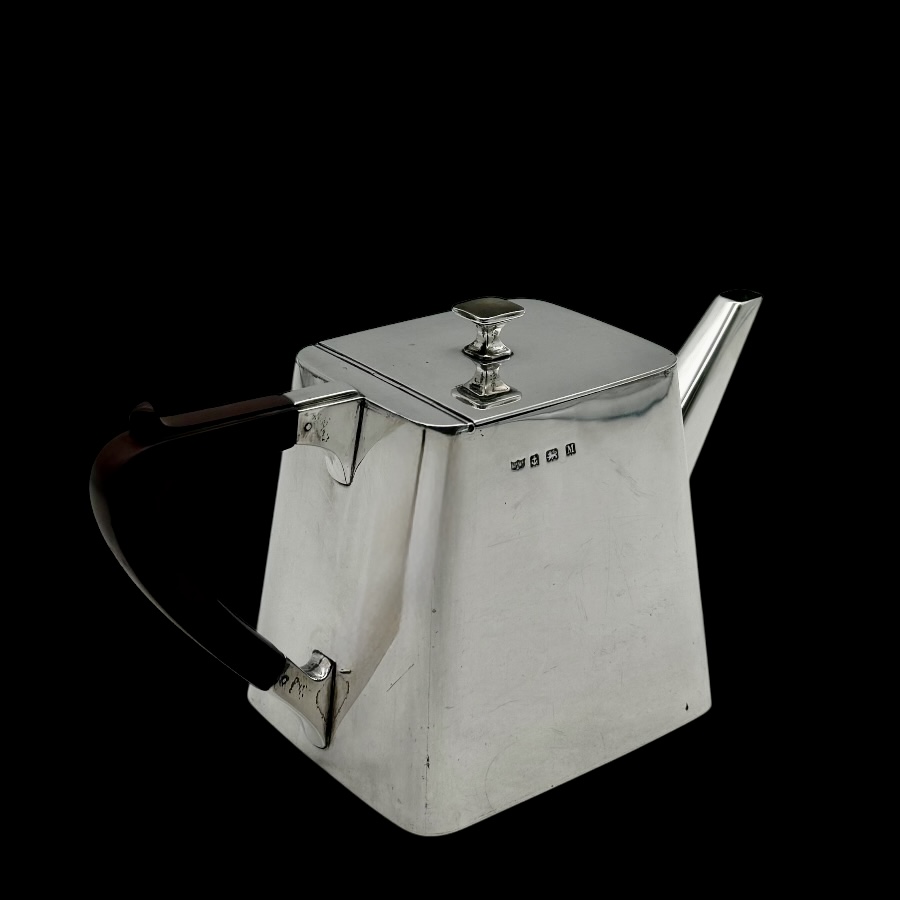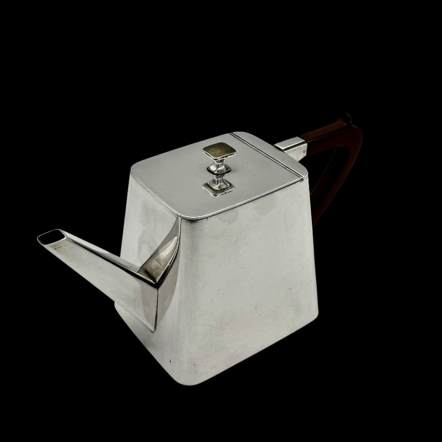 Unbelievably stylish sterling silver teapot designed with elegant tapering walls and a desirable straight spout. The lid is flush hinged and the handle is a modern take on the traditional scroll formed designs.