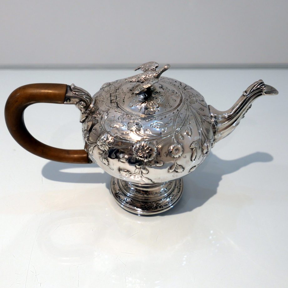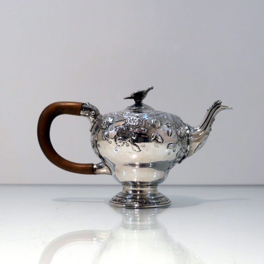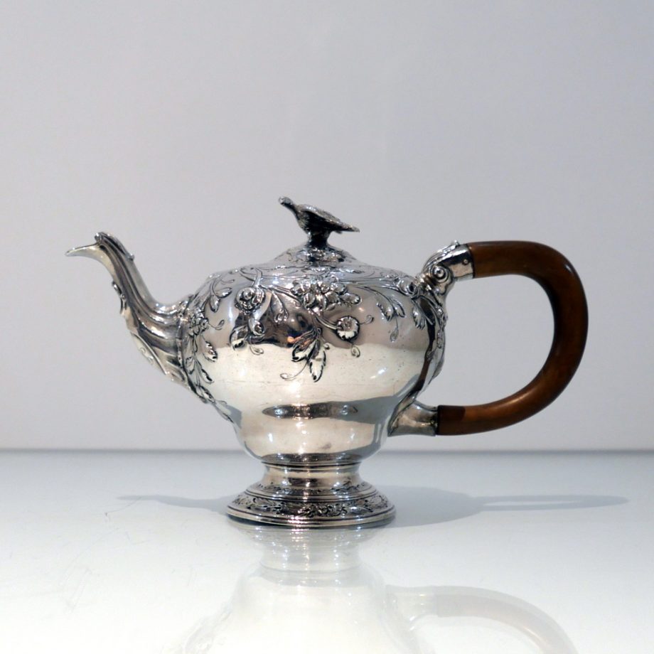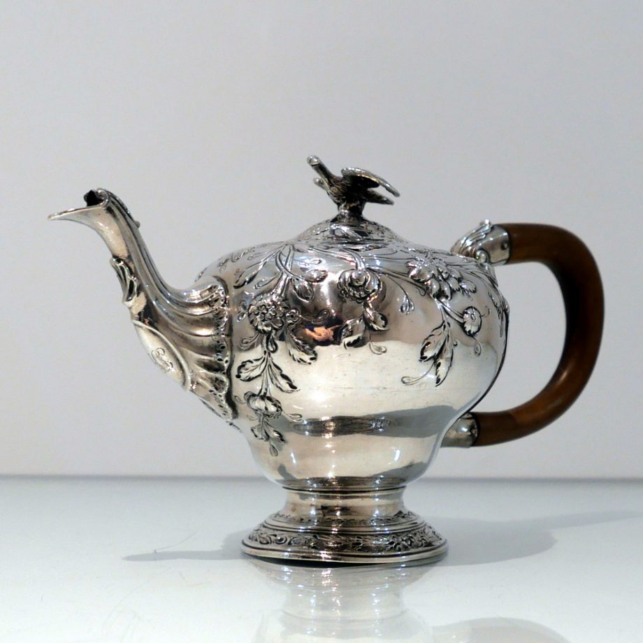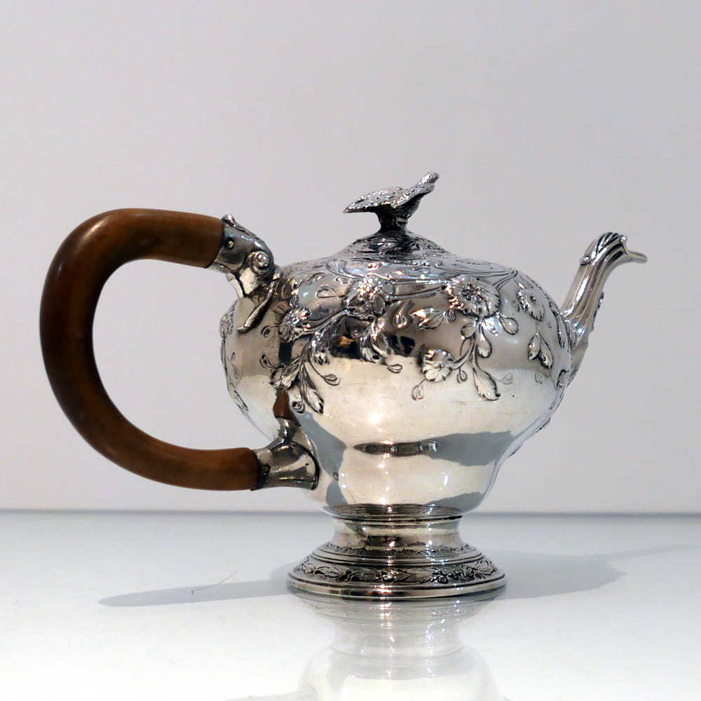 A rare and extremely fine early George III rococo bachelor teapot decorated with fabulous contemporary floral embossing. Â The slightly domed lid has an elegant flush hinge and is crowned with a stylish finial.