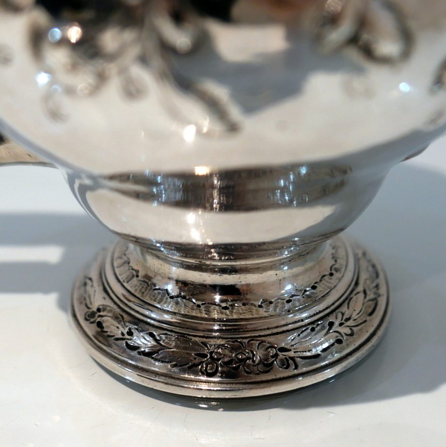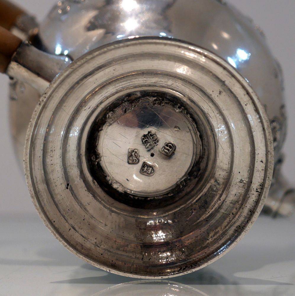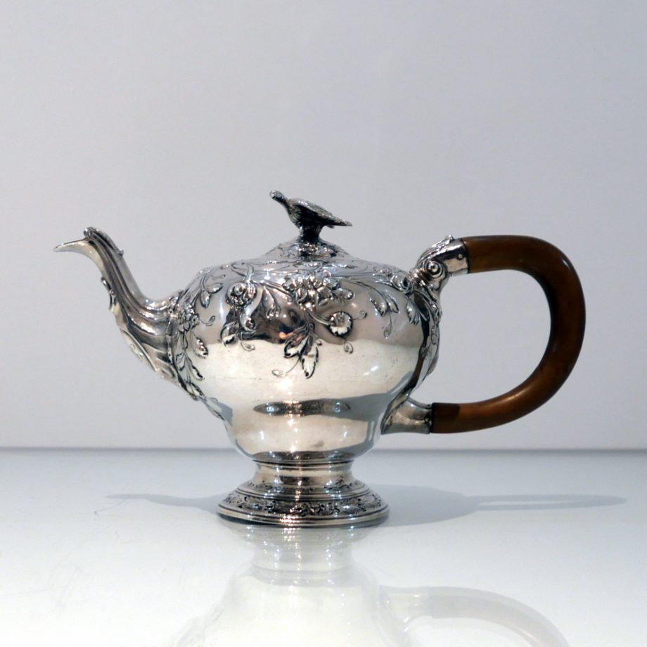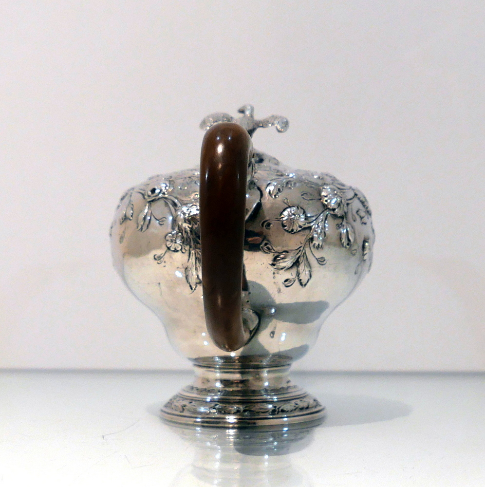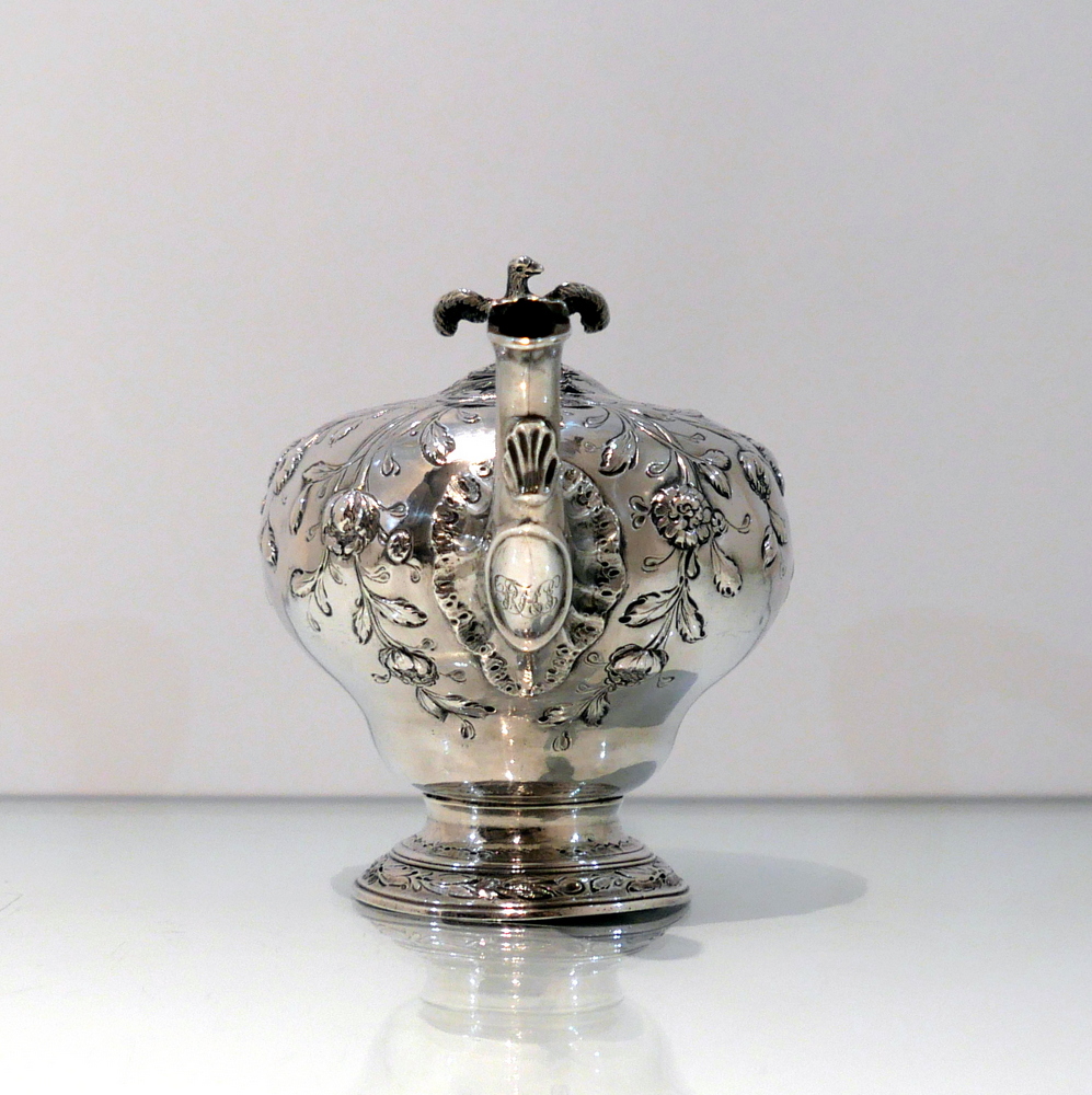 A rare and extremely fine early George III rococo bachelor teapot decorated with fabulous contemporary floral embossing. Â The slightly domed lid has an elegant flush hinge and is crowned with a stylish finial.