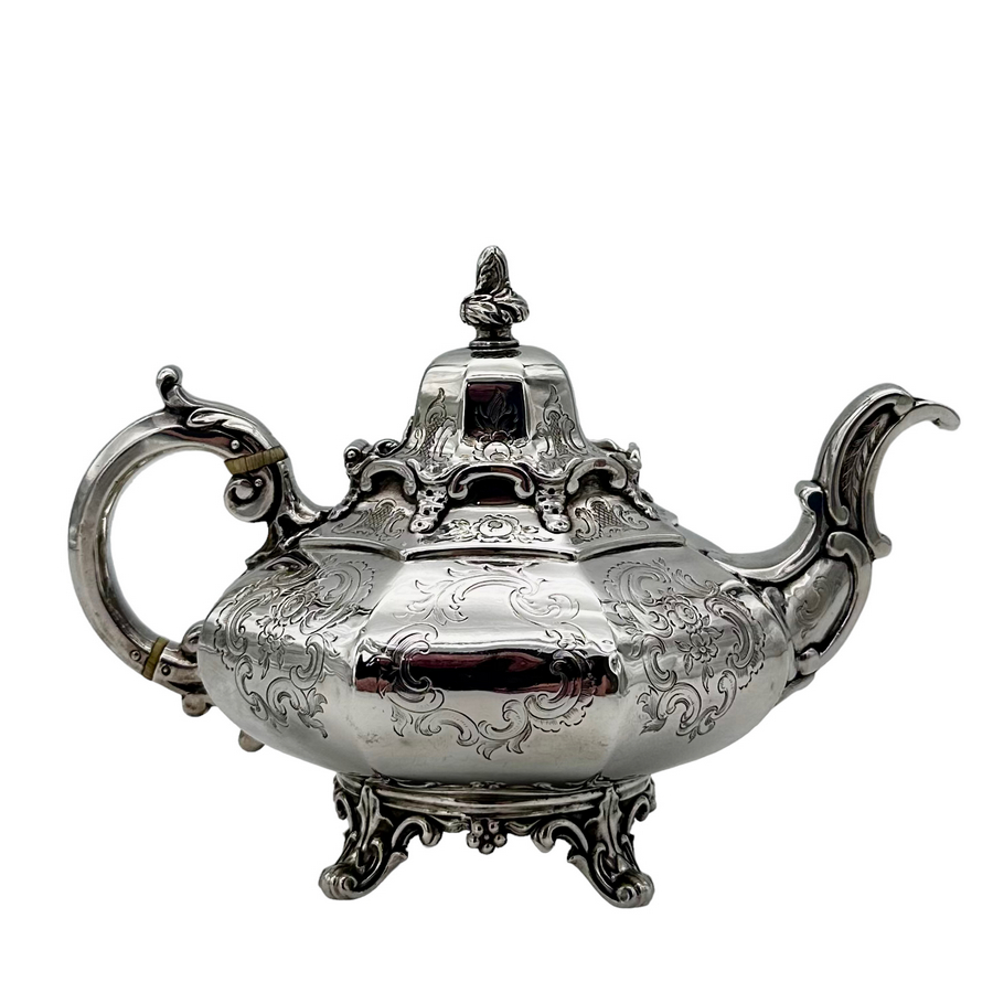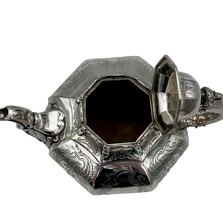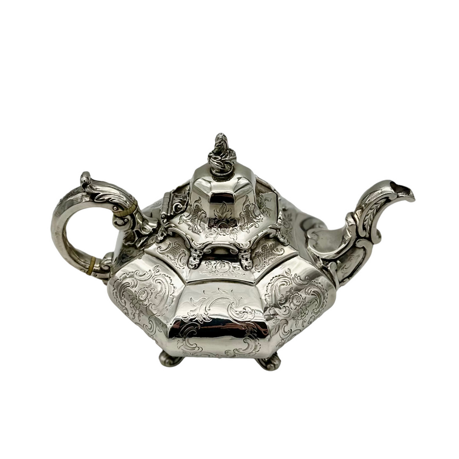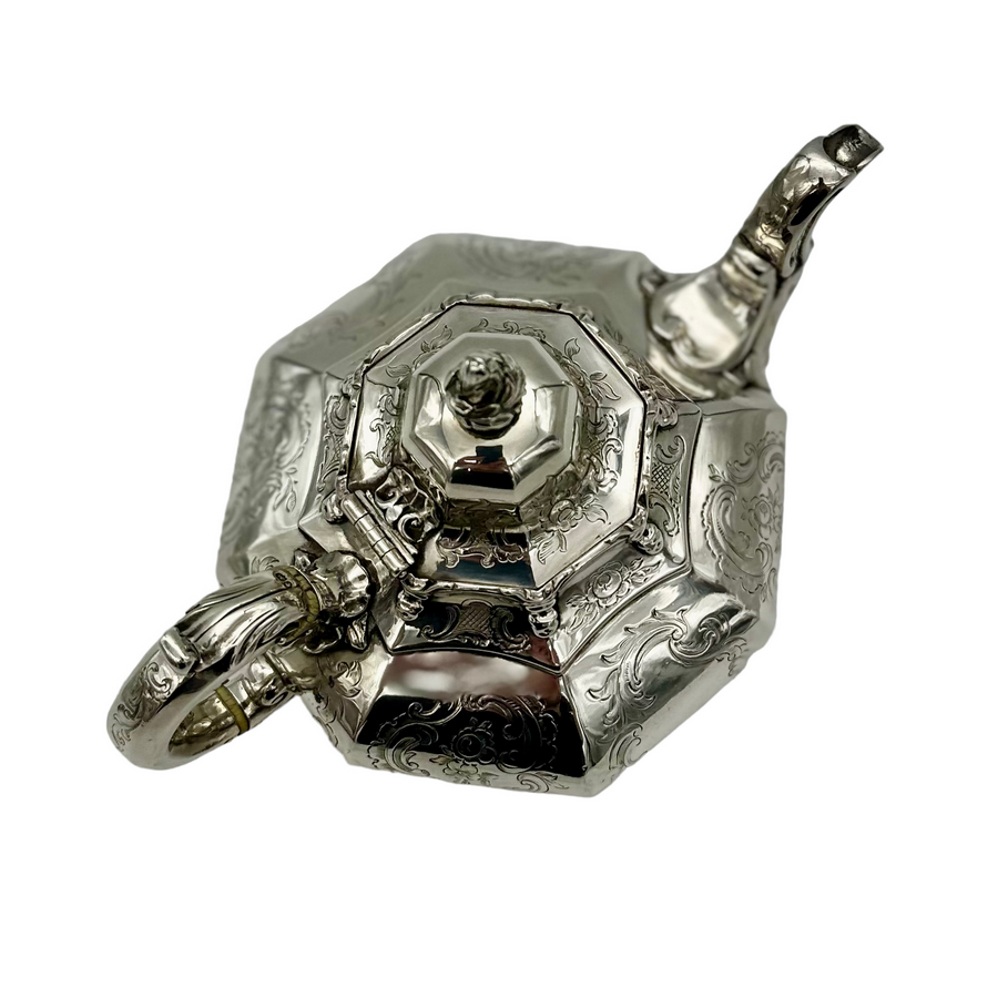 Sweet and incredibly rare octagonal Victorian silver teapot designed in a faboulous Gothic style and decorated with stunning hand engraved cartouches inset with elegant floral motifs.
