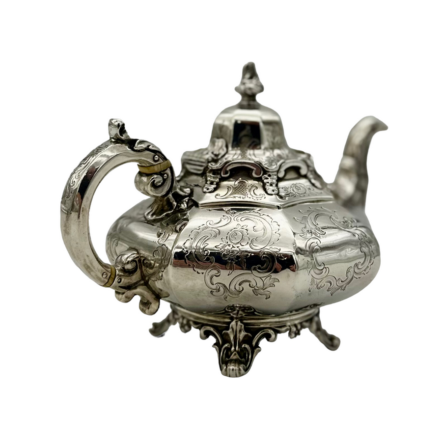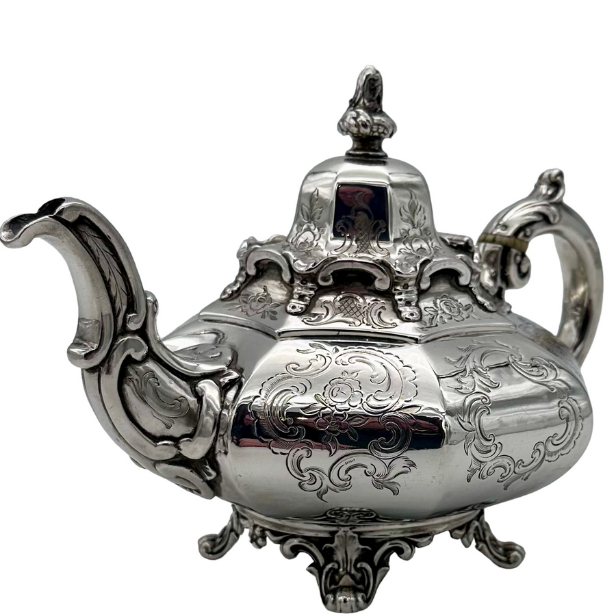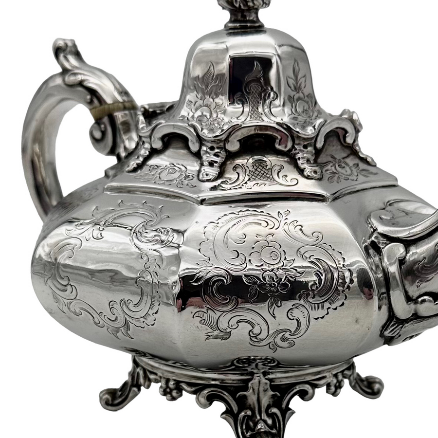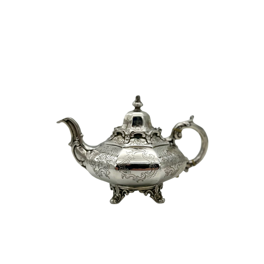 Sweet and incredibly rare octagonal Victorian silver teapot designed in a faboulous Gothic style and decorated with stunning hand engraved cartouches inset with elegant floral motifs.