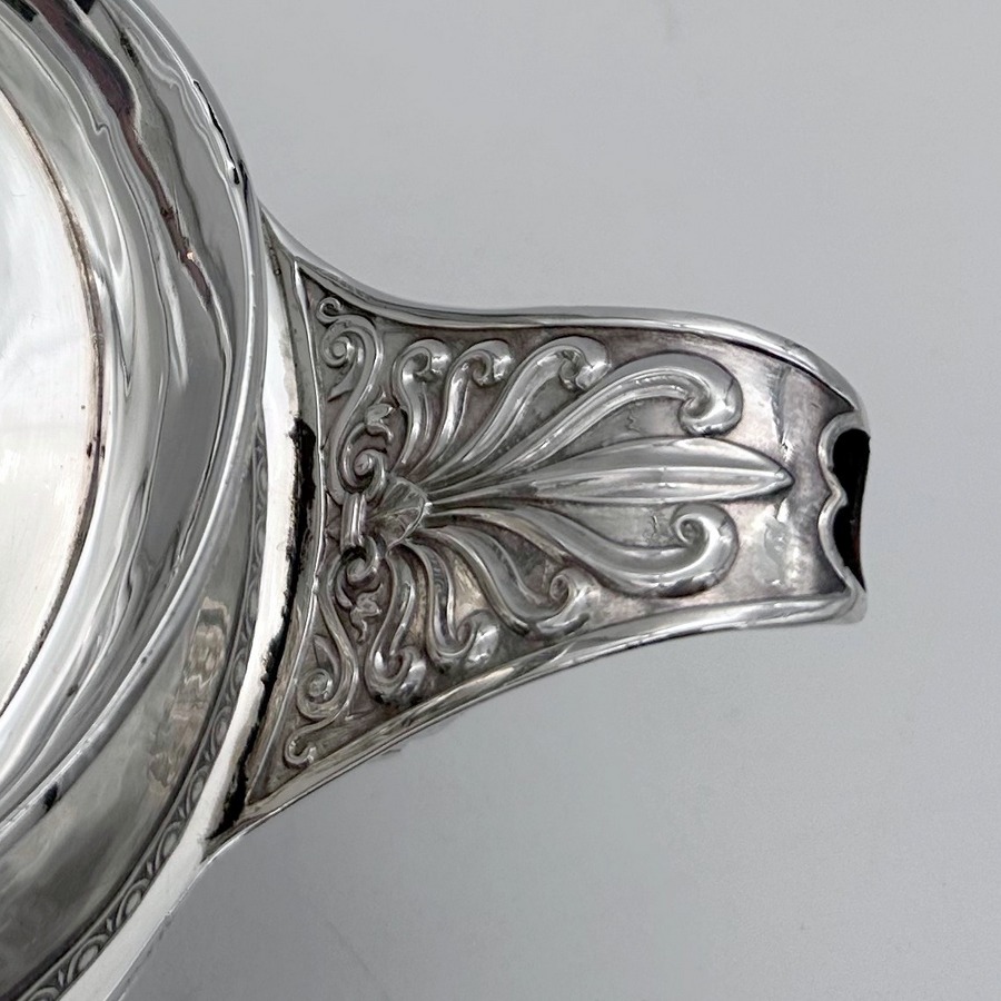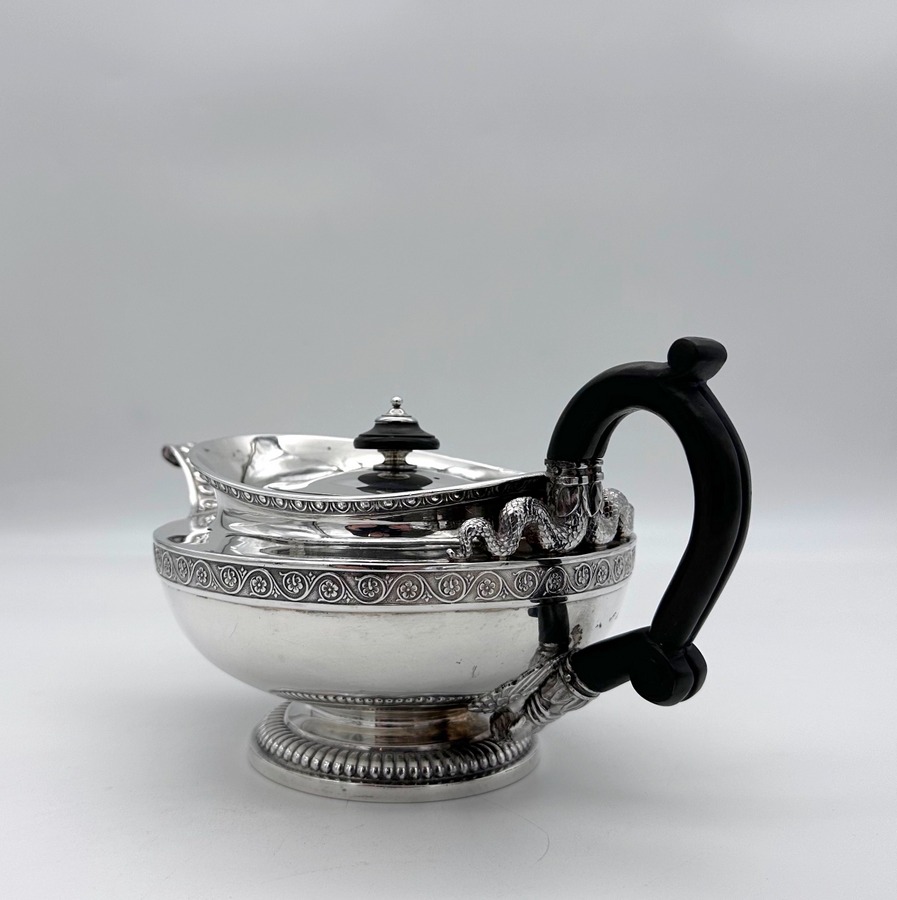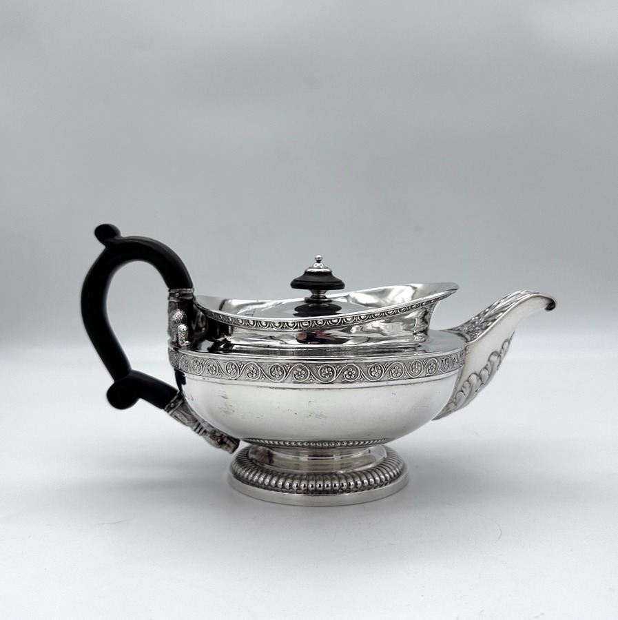 Stylish lamp formed Georgian silver teapot decorated with an elegant applied scrolling floral gallery band and sitting on a circular lobed decorated foot. There is a wonderful original crest for importance.